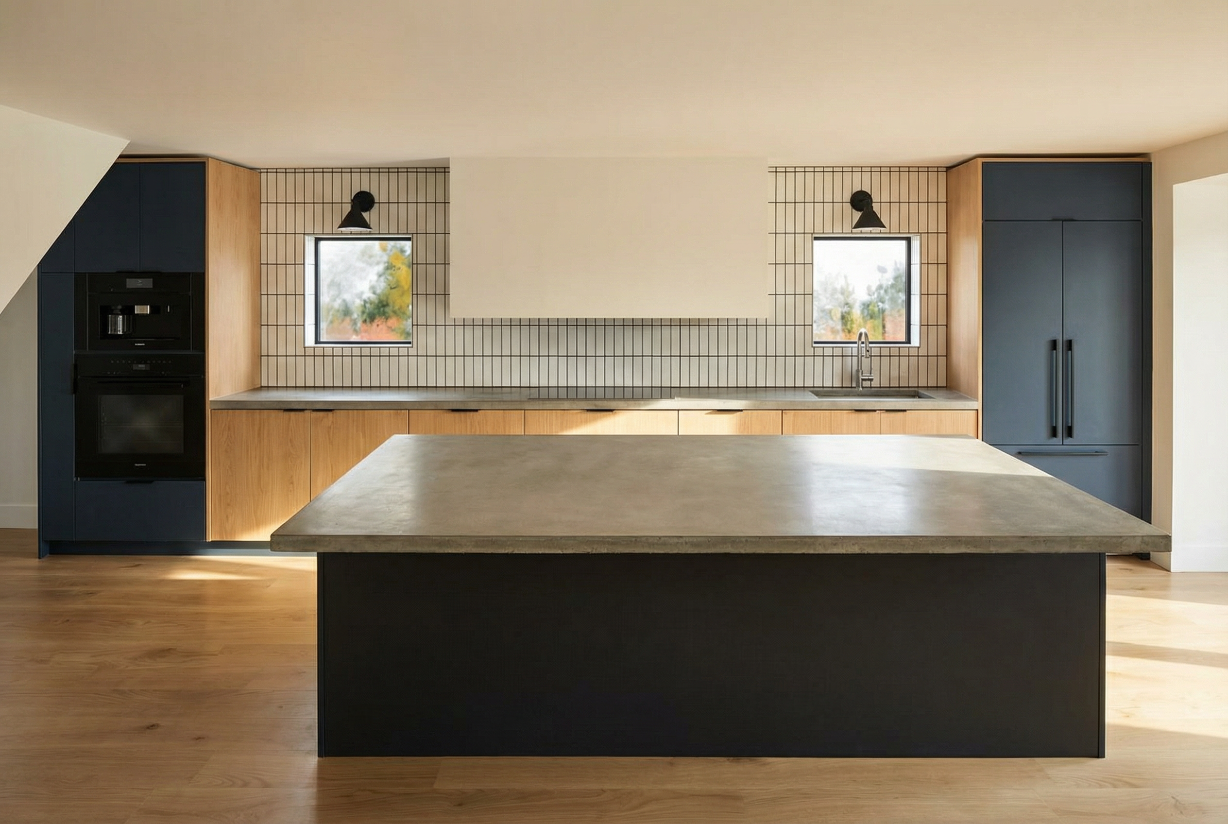black roof white siding light grey rock wainscot black garage doors with windows on the left side