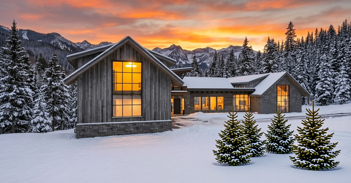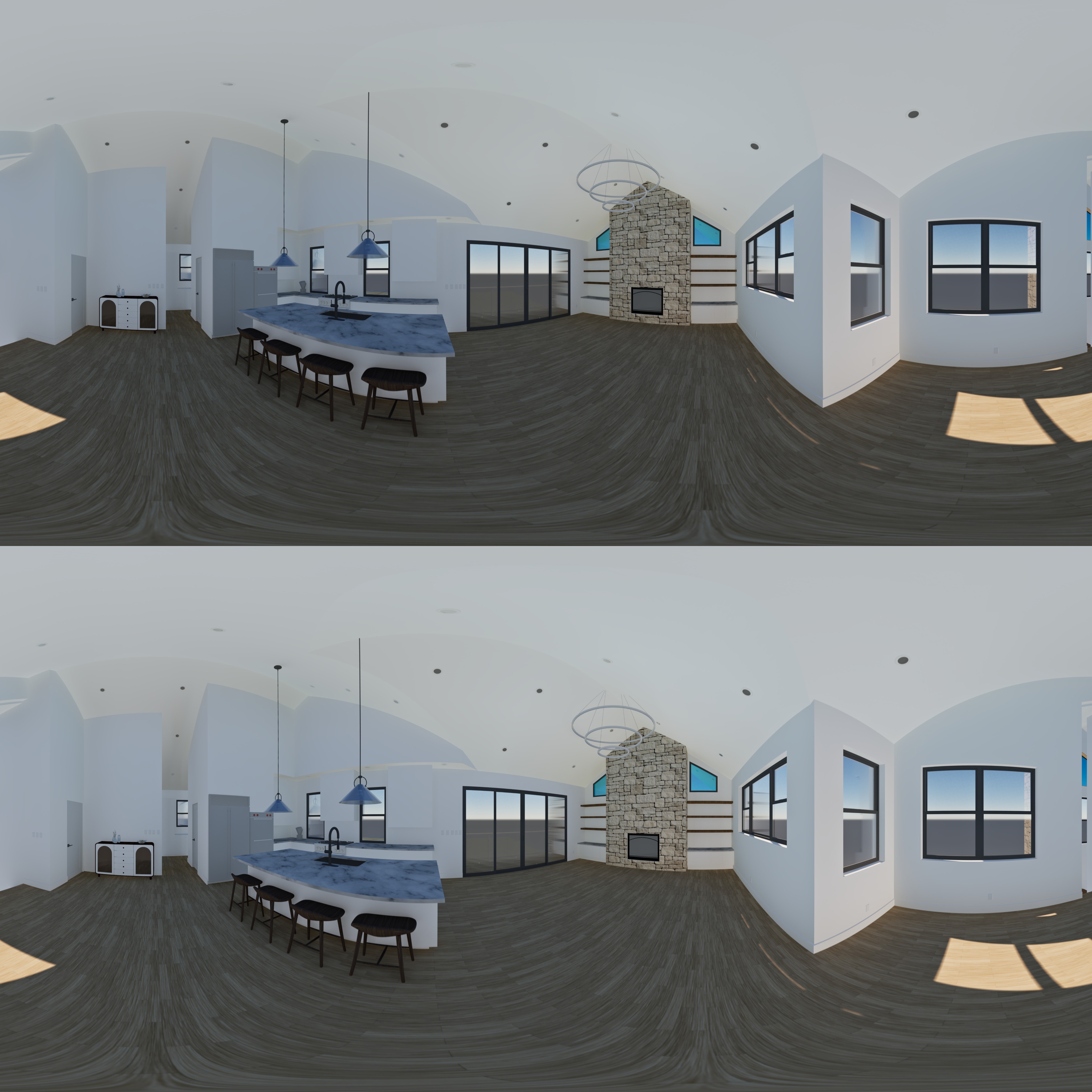 exterior shot render a modern elegant kitchen and living space with a high vaulted ceiling include large windows that allow natural light to flood in creating a bright and airy atmosphere use a soothing color palette with soft white walls and dark wood flooring for contrast feature a contemporary island with a marble countertop in shades of blue and grey paired with sleek black bar stools highlight the stone fireplace wall with a warm natural stone texture and use dark framed windows for a touch of modernity incorporate pendant lights above the kitchen island with a subtle blue hue ensure the overall atmosphere feels spacious inviting and stylish