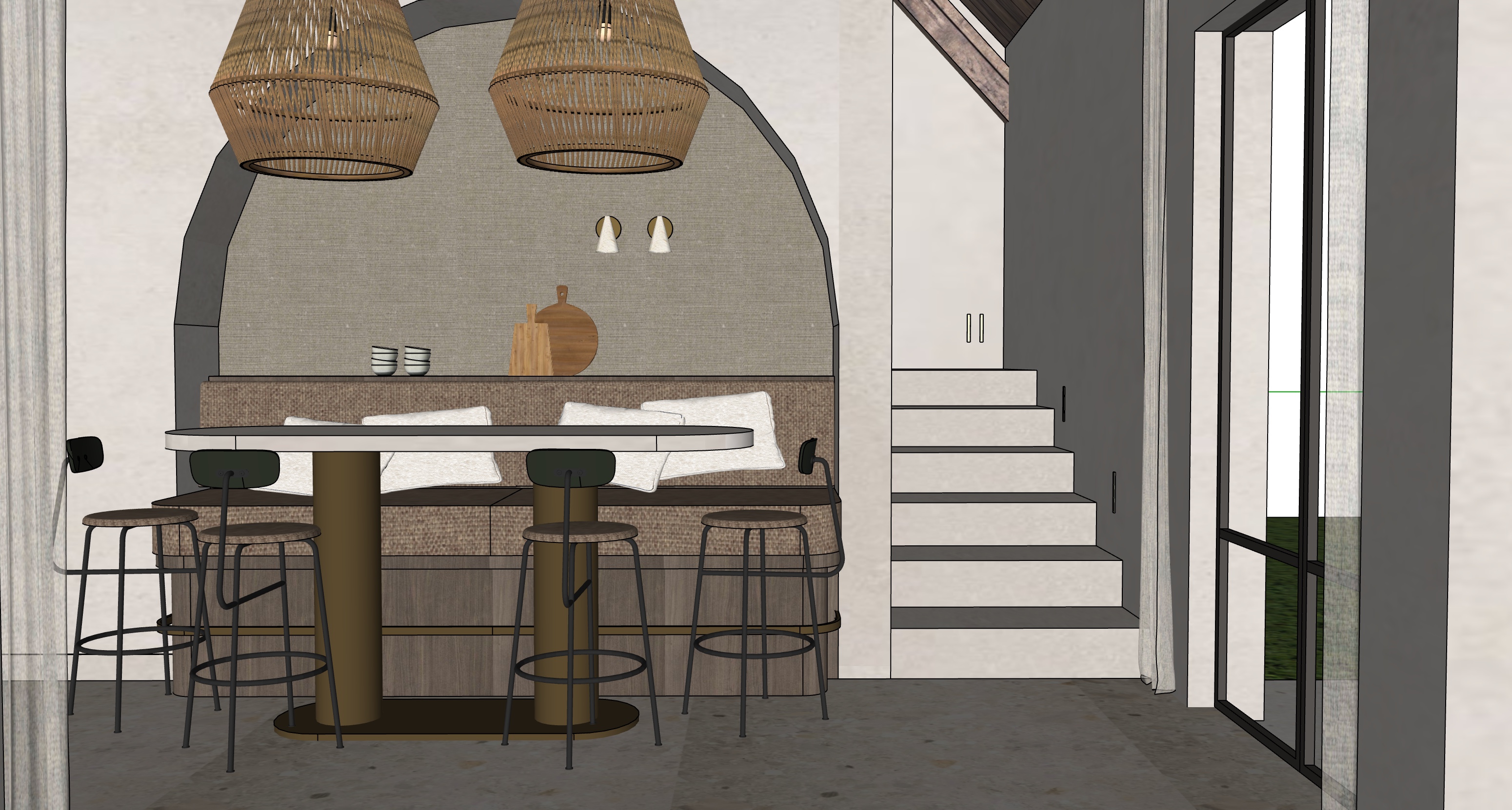 de vloer mag beige beton zijn de poten van tafel donker hout