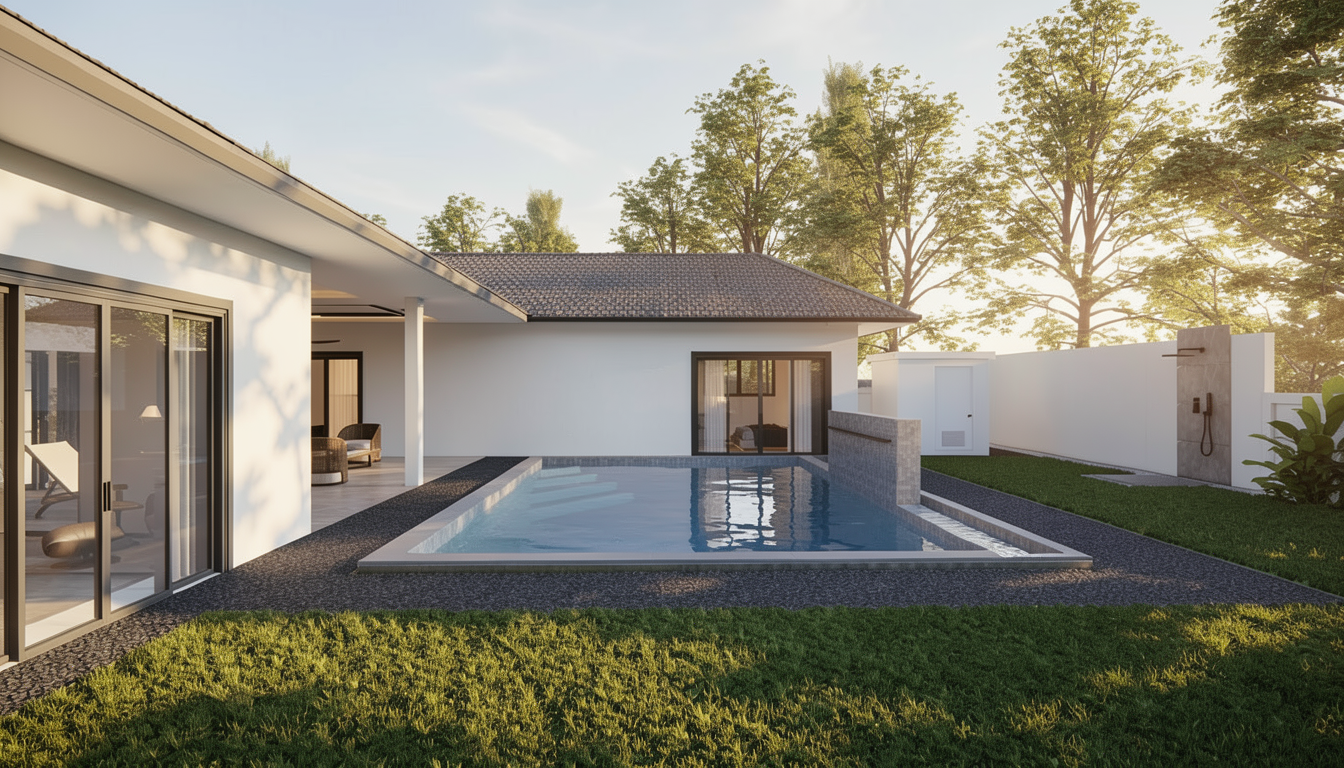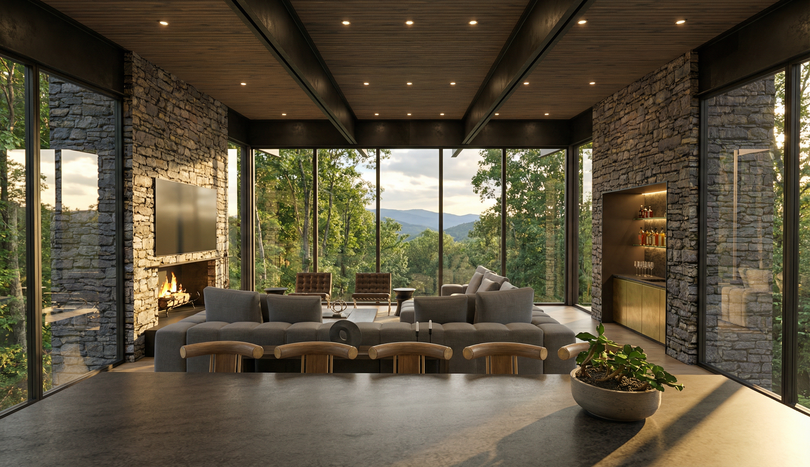make this internal view look modern and realistic lots of natural light make the oak trusses look realistic and use luxury materials do not add any furniture to the image