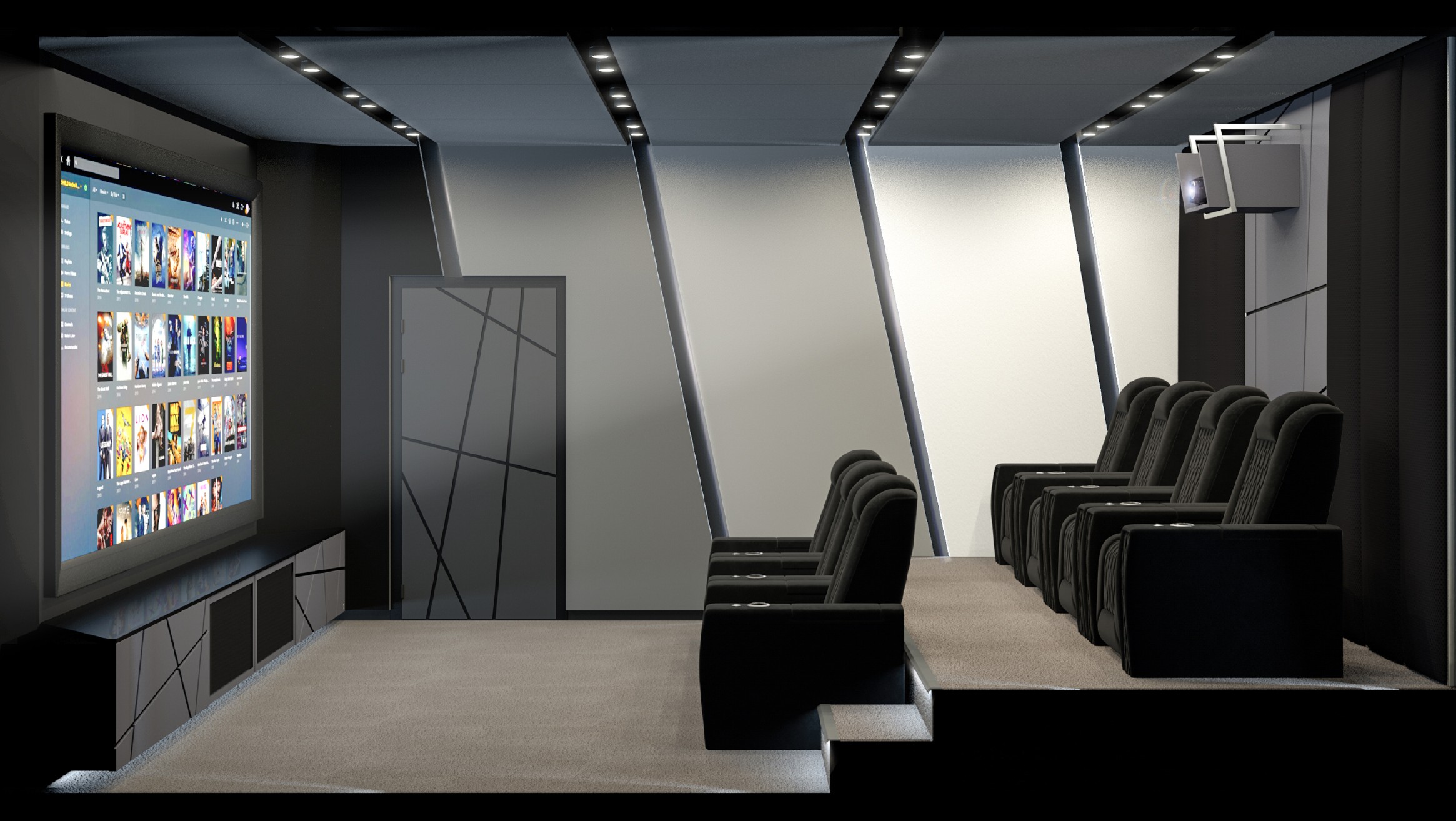 render a modern home theater room featuring sleek black reclining seats with cup holders on a raised platform the room is adorned with dark grey acoustic panels on the walls combined with ambient soft white lighting creating a cozy yet sophisticated atmosphere the large projector screen at the front displays vivid high definition movie thumbnails adding a pop of color the ceiling is designed with futuristic parallel light fixtures lining the room and the carpeted floor is a subtle taupe enhancing the inviting environment a door in the background with a geometric pattern complements the modern aesthetics architecture