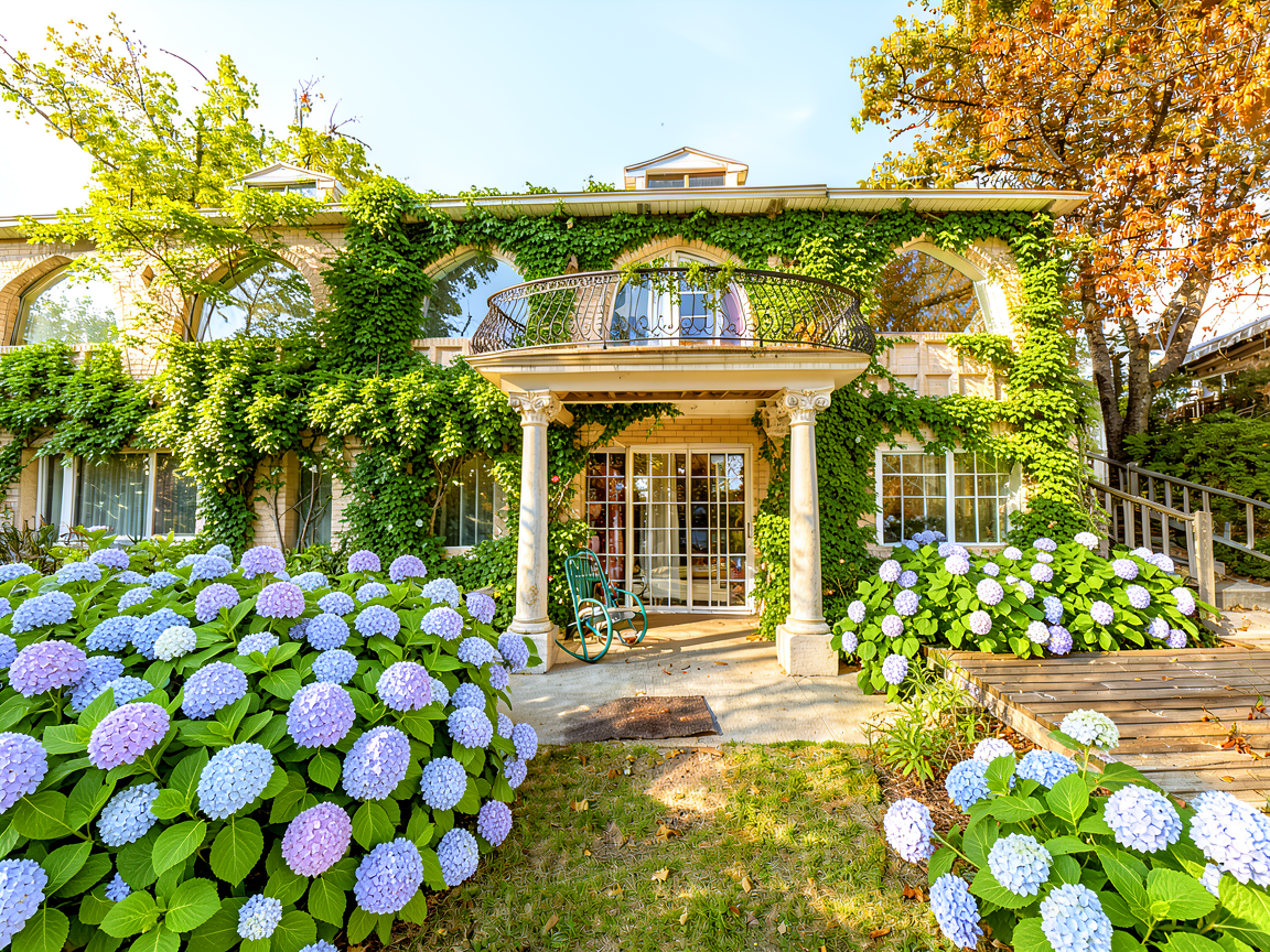 replace the current bushes with hydrangeas make the grass more green lets also have a thin layer of jasmine going up the house a little bit