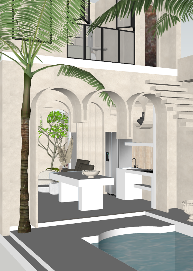 generate a hyper realistic render of the villa keep the spatial design identical to the reference enchance materials lighting and textures for the photorealism leaves stone wall water shadows plants make the lighting bright cozy natural ultra high resolution like a professional architectural photo architecture