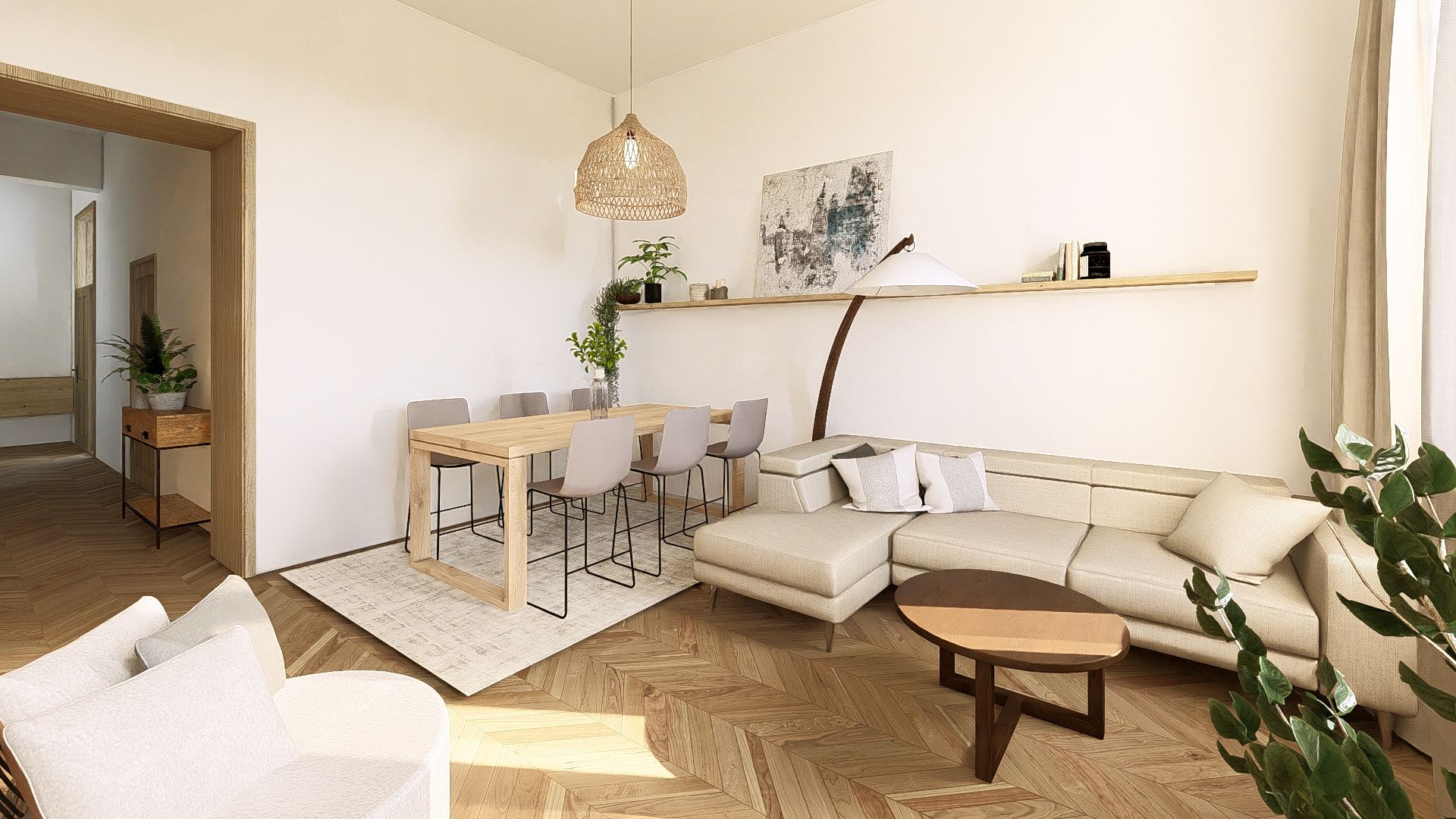 make this render more realistic dont change the colors and the shapes dont replace the standing lamp next to the sofa