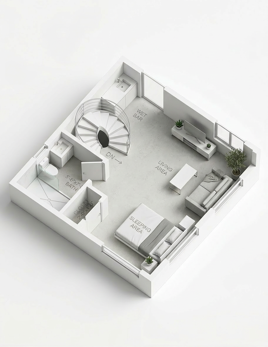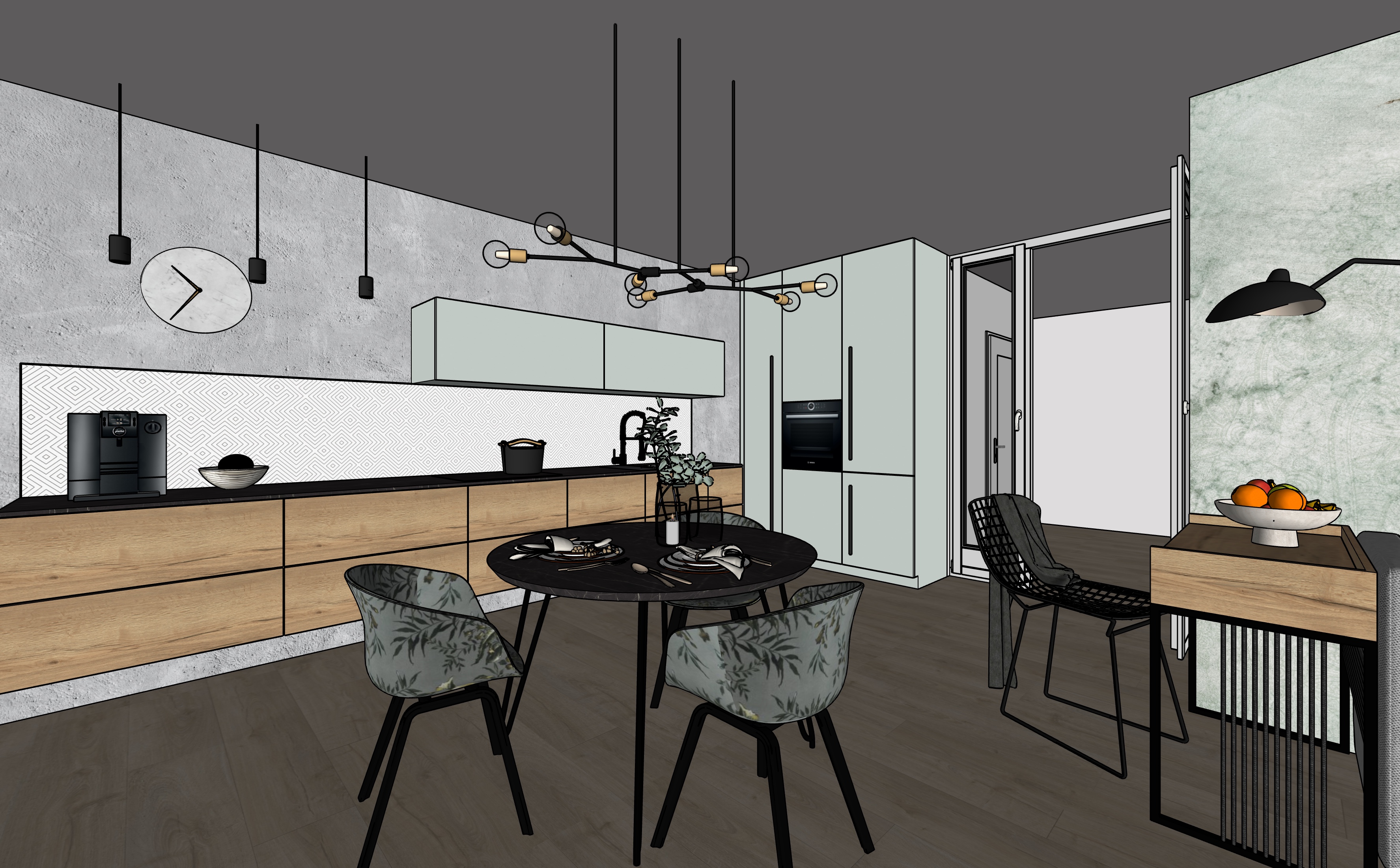 create a photorealistic interior photograph based strictly on the provided design visualization preserve the exact layout proportions furniture placement colors and all design elements without any changes or additions this is a realism enhancement task not a redesign use high quality natural materials with realistic textures wood fabrics matte surfaces and accurate detailing improve material realism while keeping original colors and finishes lighting should be soft natural daylight with subtle shadows creating a warm inviting atmosphere use balanced exposure realistic highlights and no overexposed areas add gentle ambient light for depth maintaining a cozy and harmonious mood camera should mimic a professional interior photography shot eye level perspective 24 35mm lens equivalent sharp focus high dynamic range and natural depth ensure high resolution clean composition no distortion no added objects and no stylistic reinterpretation the result should look like a real photograph of the exact designed space st na na n zkou sekc kuchyn m jemn betonov dekor horn sk ky nad n zkou sekc kuchyn maj sv tle edozelenou barvu stejn jako vysok sekce kuchyn nad n zkou sekc kuchyn je na st n b l deska s jemn m ernob l m grafick m vzorem j deln st l m tmavou jemn mramorovanou desku