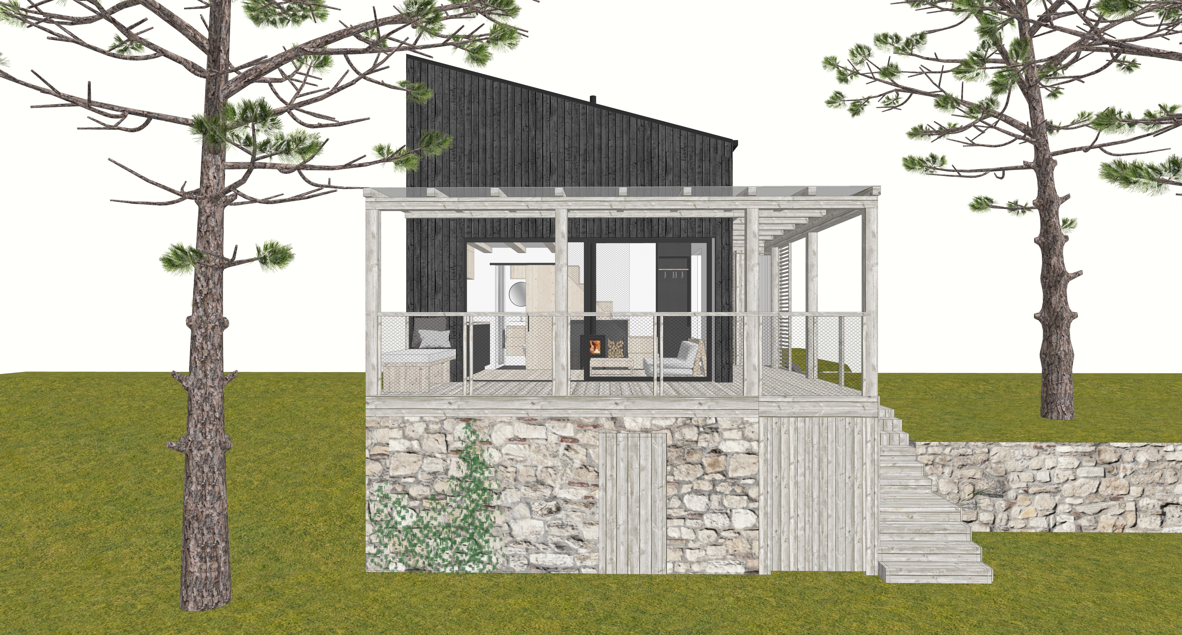 cottage in the deep woods surrounded by trees smoke from the chimney shrub and ferns on the left side