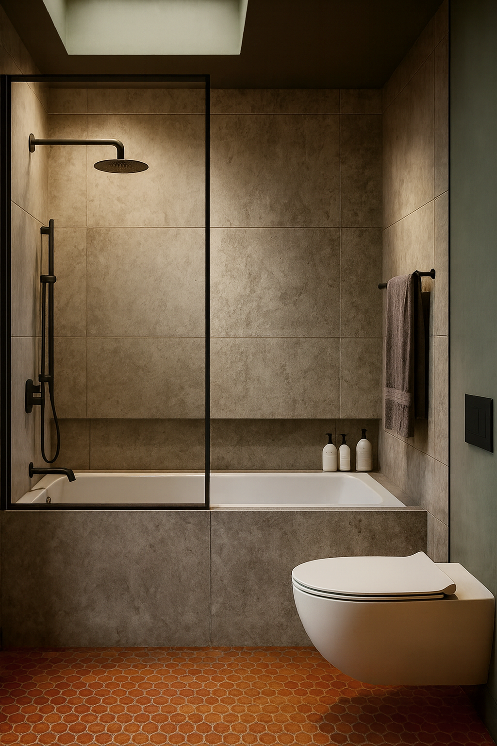 keep everything the same just remove the white soap bottle sin the back make the floor small rectangular tiles in orange instead of that mosaic