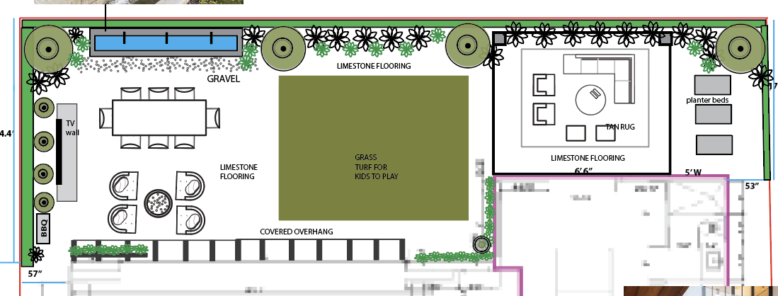 use this drawing of a backyard and come up with a better lay out include a dining area tv entertainment wall outdoor open room grass area