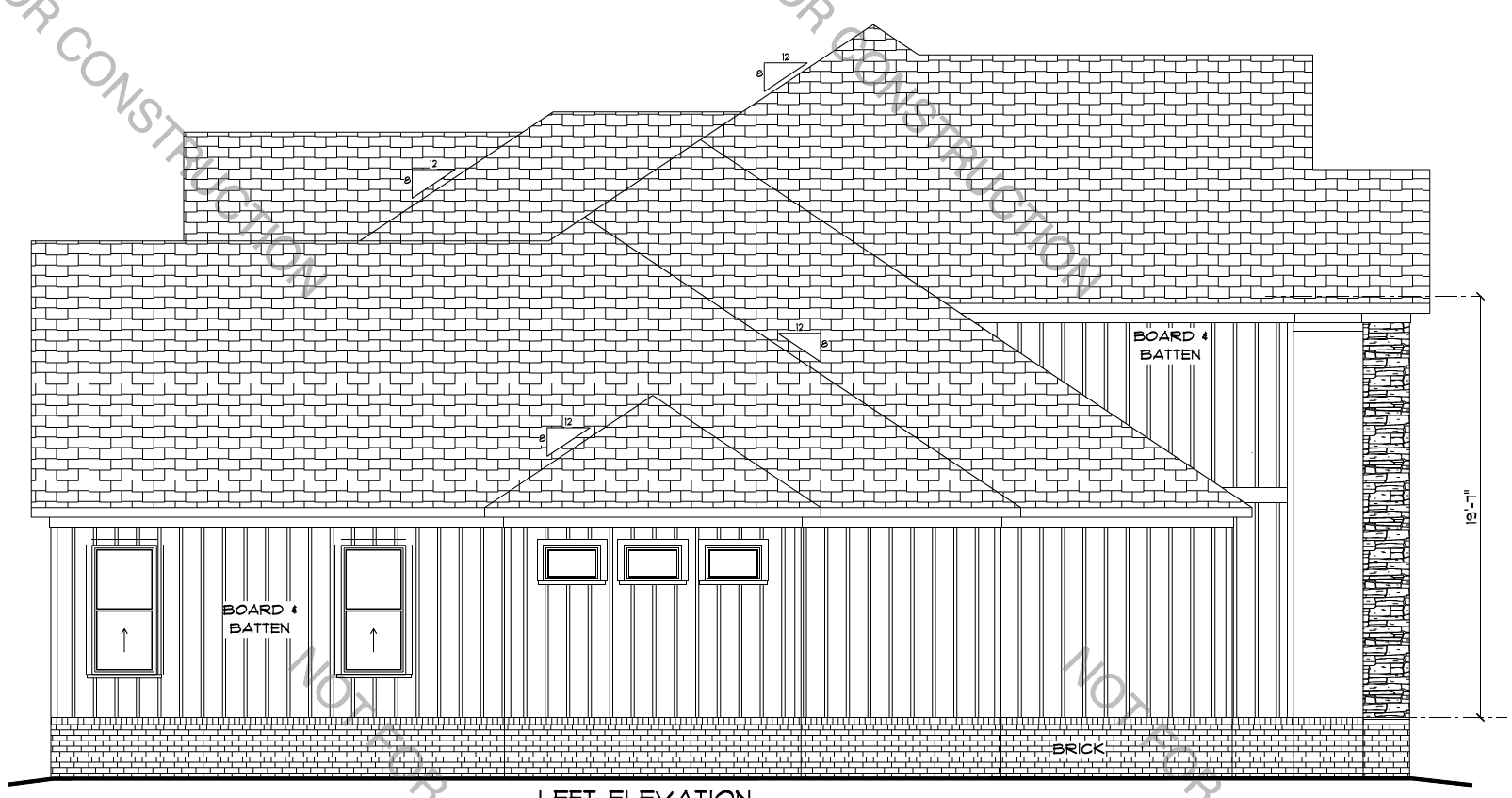 this house will have a black shingle roof black windows black trim the board batton and brick base will be white stone will be off white