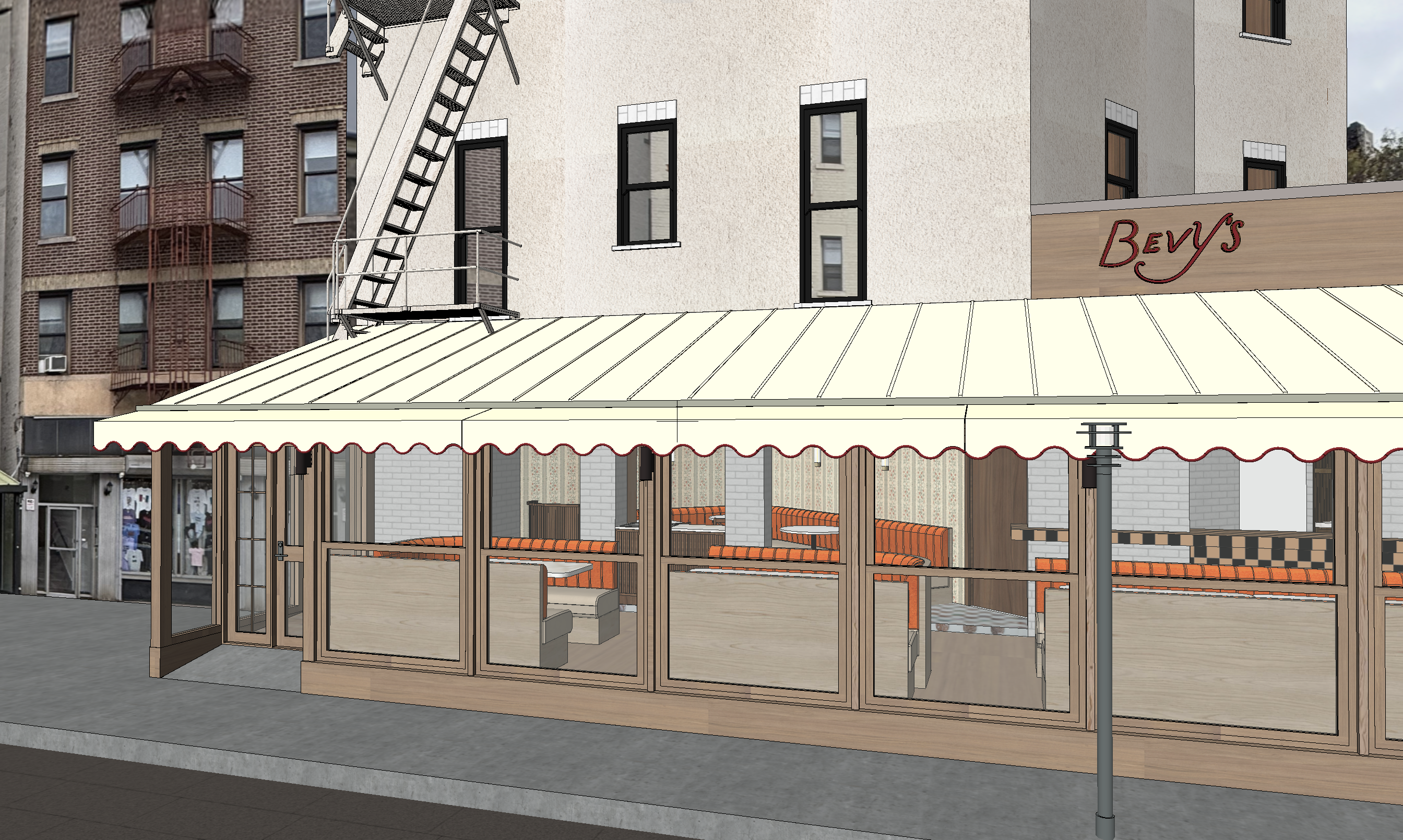 ultra photorealistic daytime exterior render of the bevy s restaurant in new york preserving the exact architectural proportions and layout of the model a beige standing seam metal roof with warm subtle tonal variation paired with a beige fabric awning featuring a clearly visible deep maroon scalloped piping along the lower edge a long glass storefront constructed from light oak wood frames with natural grain detail including light oak mullions transoms and base panels the interior visible through the glazing showing orange channel stitched banquettes subtle fa ade window line spotlights mounted on the wood structure and the bevy s sign rendered as a thin continuous red neon tube perfectly following the handwritten outline of each letter bright glowing with a soft red halo similar to the reference neon image the entire scene is illuminated by clear midday sunlight with crisp shadows realistic reflections on the glass high resolution material texture for wood metal neon and fabric and a typical new york brick building backdrop