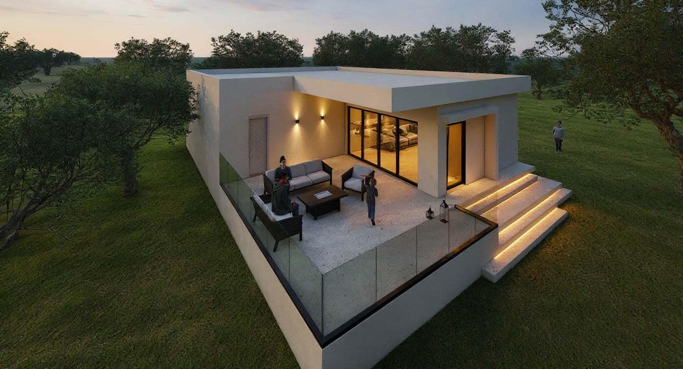 improve the photo make it natural and luxurious add handles in the doors add warm interior light and rular information n the backeground the right door should be black safety door and the left door should be white more simple door improve also the light in the wall near the black door in that wall around the black door add led stripe please