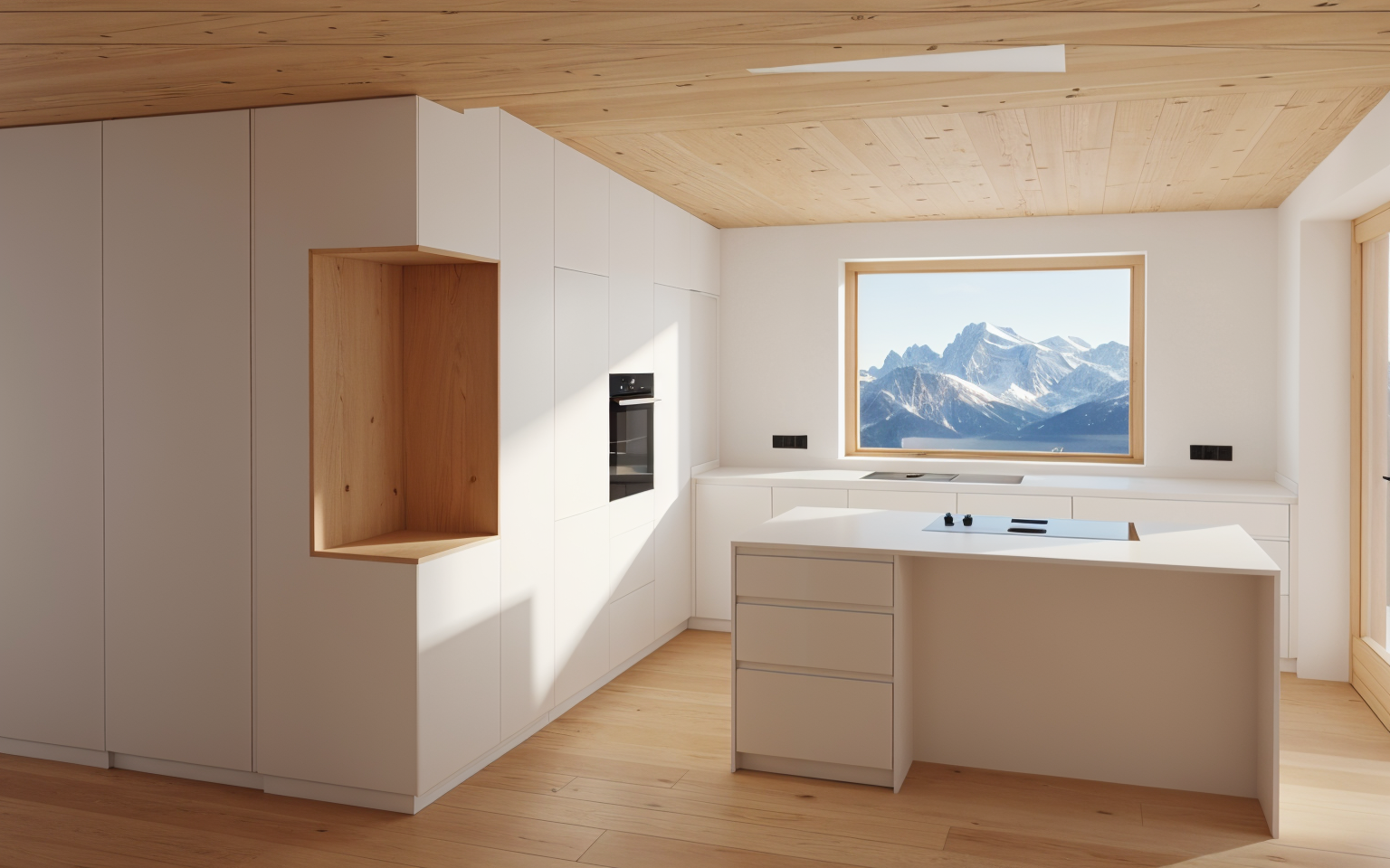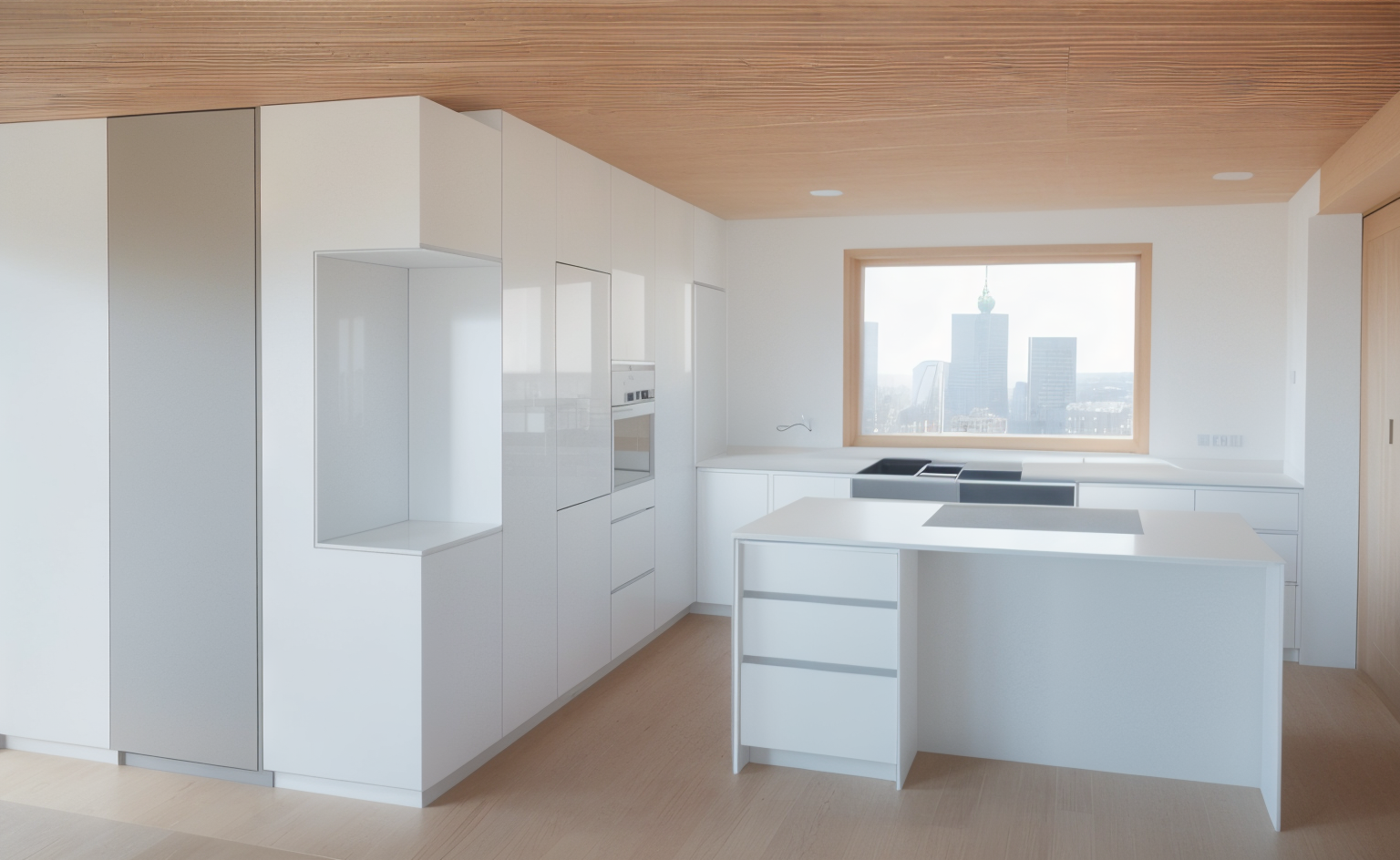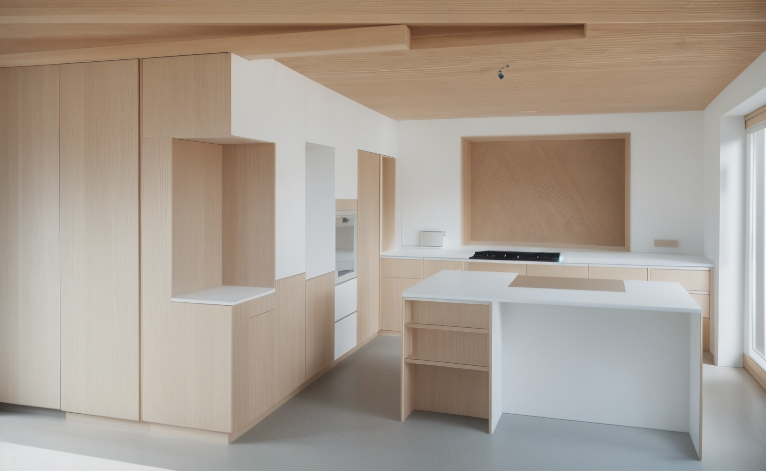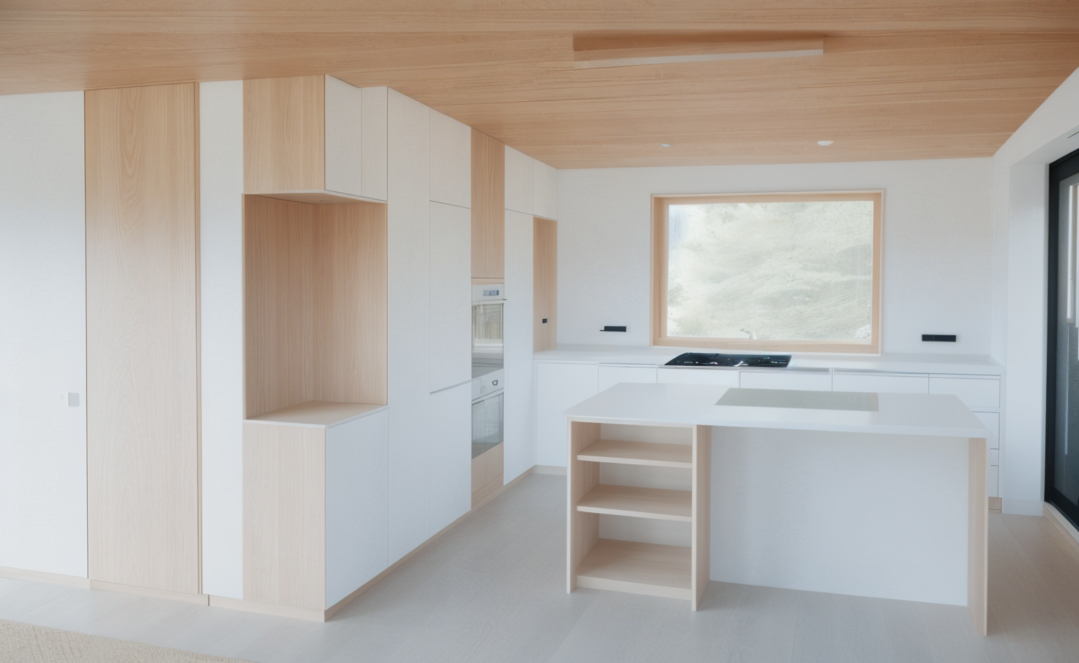 modernist interior shot floor in oak bright ceiling in fir all panels white only 1 oven architecture