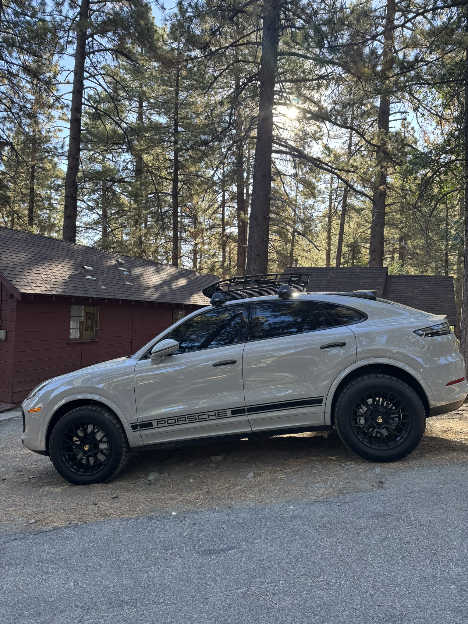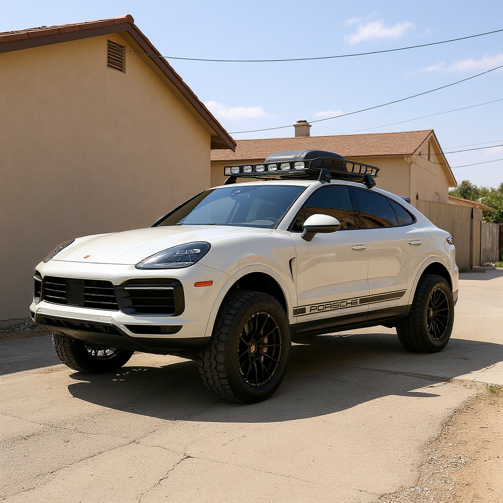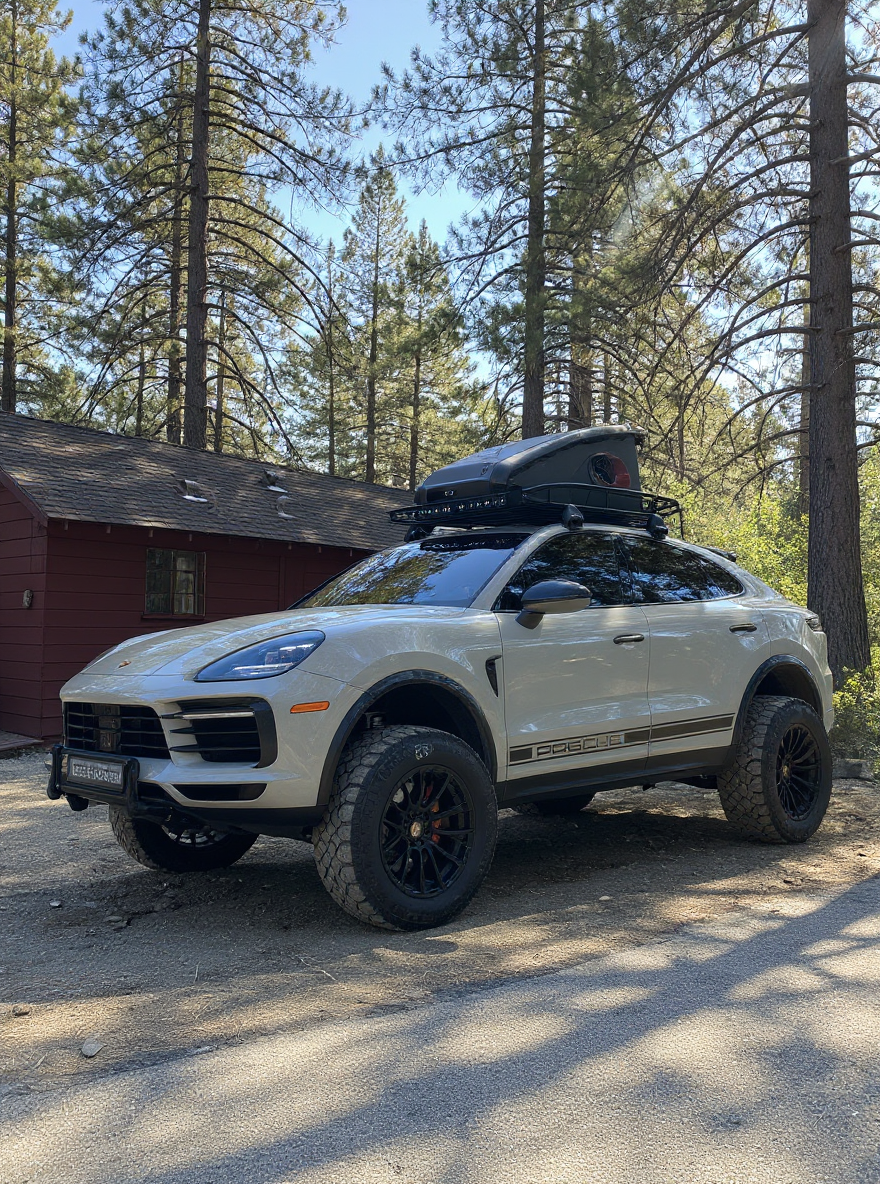 2020 porsche cayenne turbo coupe with 3 lift 33 oversised offroad tires black steel bumper with large rally lights at front spare offroad tire on roof rack lights on roof rck porsche side decal