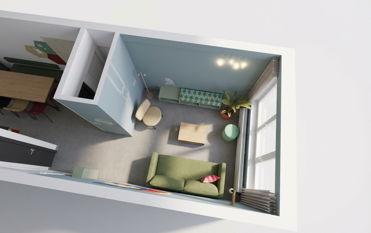 make photo realistic add fire in fireplace natural light come from camera corner wall and moldings are white keep existing don t add anything keep colors and textures
