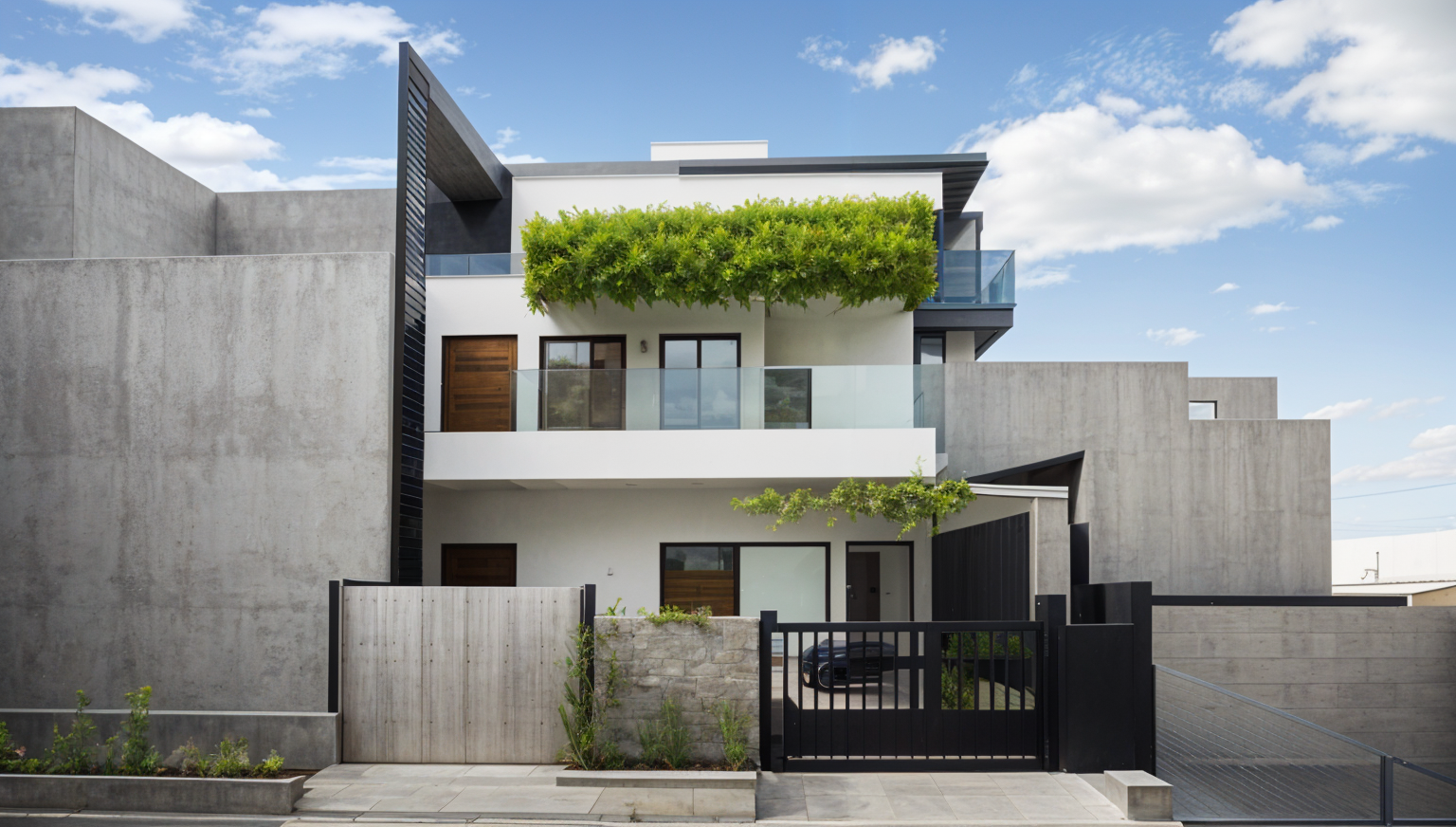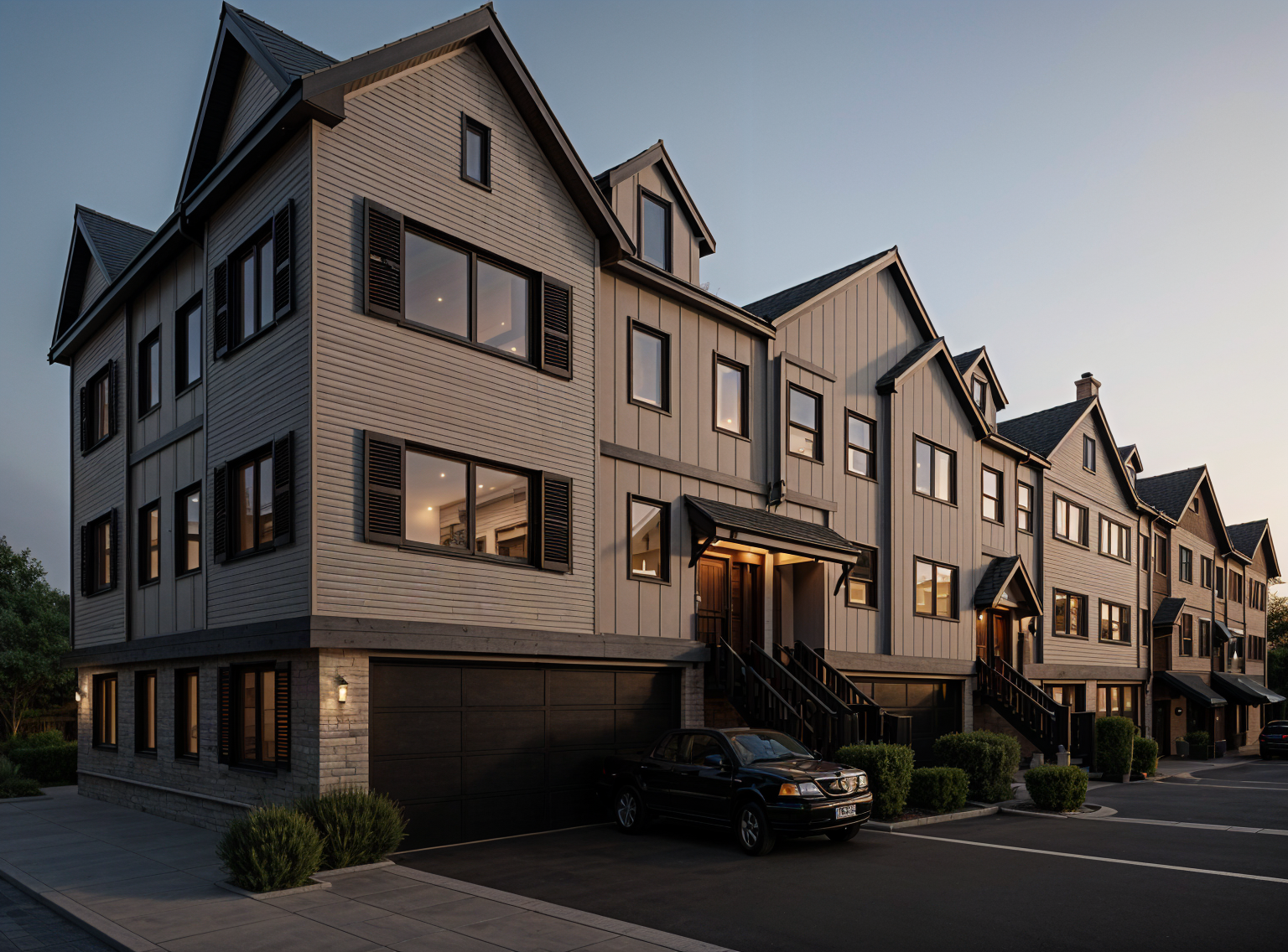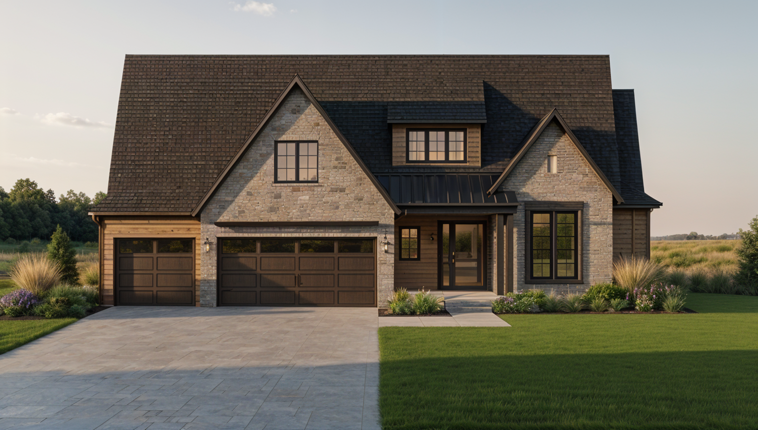 photorealistic straight on exterior rendering of a modern craftsman style home with mid tone natural wood siding stone accents black soffit and fascia black window frames and black metal roof details above the porch and garage the wood siding should be a smooth neutral mid tone like warm taupe or weathered oak not orange with minimal visible grain for a refined modern aesthetic scene captured at golden hour the soft warm light just before sunset creating long gentle shadows rich amber highlights on the siding and stone and a subtle glow across the landscape the front door features a pop of color navy blue muted olive green or dusty brick red finished in satin sheen that catches the low sunlight softly foreground includes a lush green lawn light gray concrete driveway and minnesota style landscaping with hydrangeas hostas ornamental grasses boxwoods and dwarf evergreens in dark mulch beds in the background show a natural wetland view with tall native grasses cattails and distant soft green vegetation plus a tree line along the left rear yard bathed in golden sunlight sky should be warm and luminous transitioning from soft orange near the horizon to pale blue higher up with gentle reflections in the home s windows composition straight on eye level no people or vehicles high realism and warm cinematic atmosphere