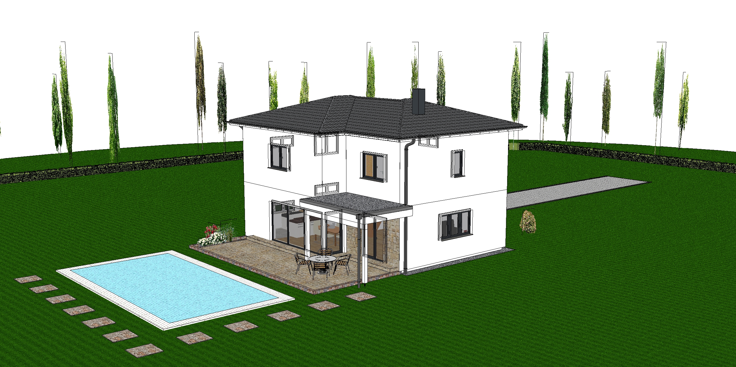 modernist exterior shot a modern two story house with a sleek white facade and a dark gray roof set in a lush green lawn in the foreground a rectangular pool with crystal clear blue water and a white border surrounding the pool stepping stones in earthy gray hues lead to a spacious patio the patio features outdoor furniture with dark metallic frames and wooden elements positioned under a minimalist pergola tall slender cypress trees line the boundary providing an elegant backdrop the atmosphere is serene and inviting captured in warm golden hour lighting architecture