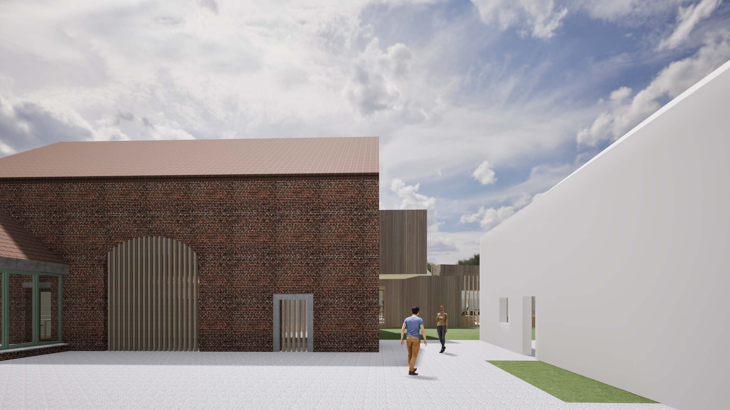 travaille comme si tu tais un professionnel dans la r alisation de rendu 3d pour des projets d architecture sans rien changer aux l ments pr sents sur l image de base rends le visuel de la nouvelle construction plus r aliste et ajoutes y une femme brune avec un cocker enfin adapte le grain et la lumi re de l image pour qu elle soit plus cin matographique laisse le rendu de la fa ade brique mais change la trame pour que ce n est pas si r p titif fais des graviers au sol rajoute de l herbe sur le surfaces pelouse mais pas sur les surfaces graviers ne change pas la couleur des ch ssis