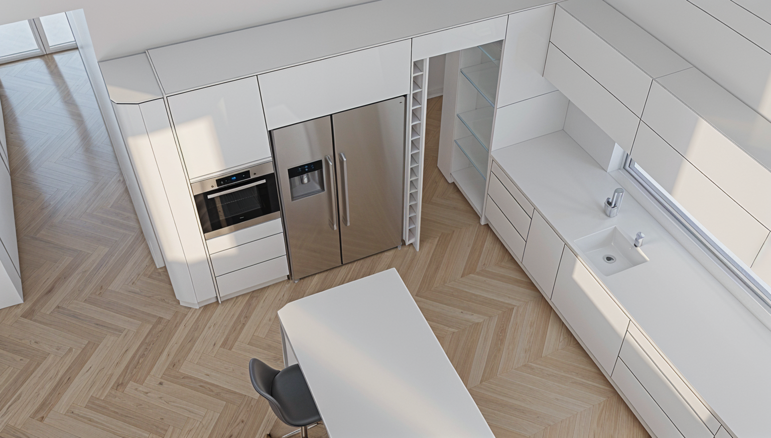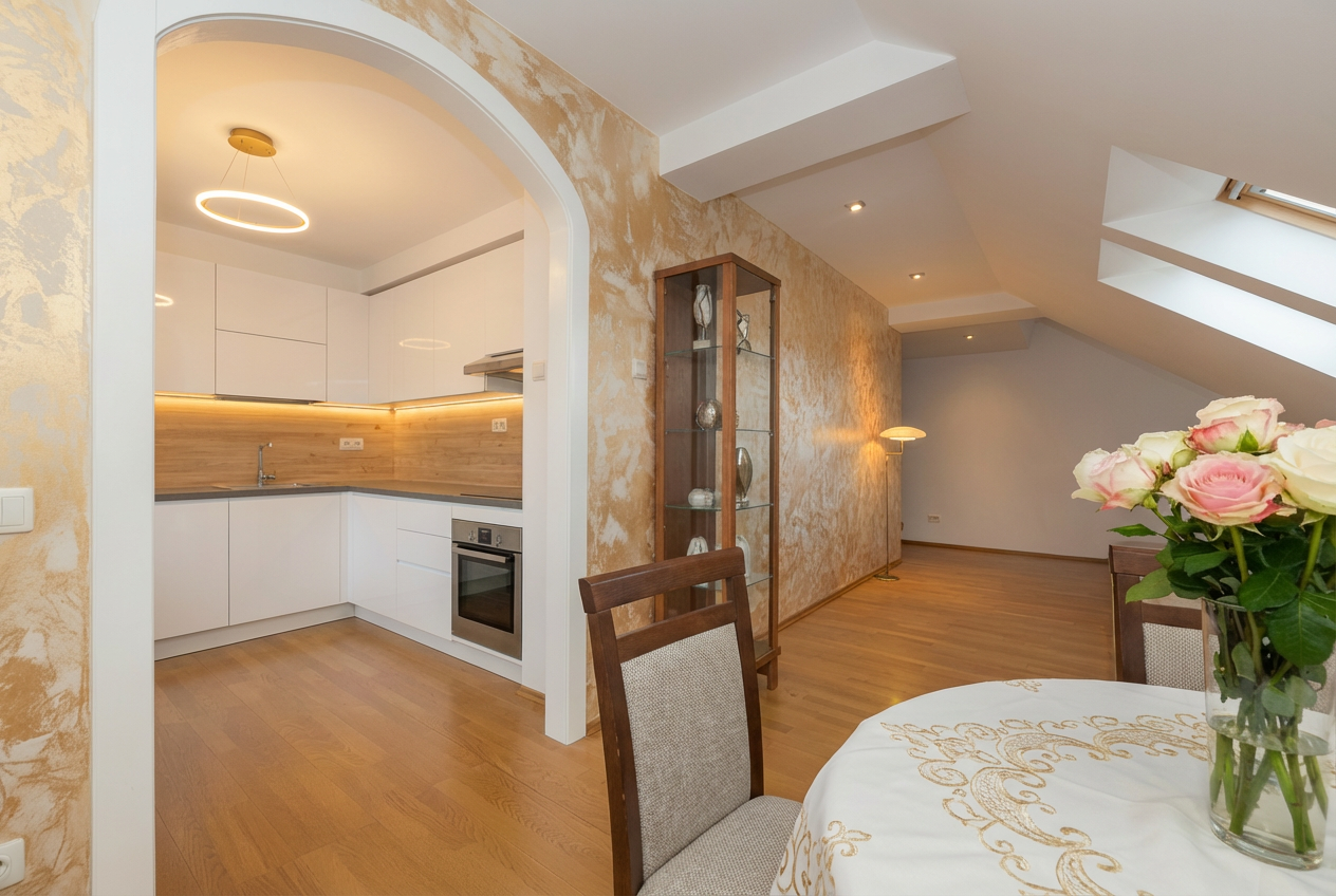 p idej modern b l televizn stolek s iroko hl m modern m oled televizorem vedle vitr ny naproti st n s dekora n st rkou a vitr nou p idej edou sedac soupravu p mo pod ikmou st podhledu zm idle za modern celo aloun n edou l tkou zm dekor na ubruse na modern vzory ale barevnost ponechej stejn tak nem um st n stolu