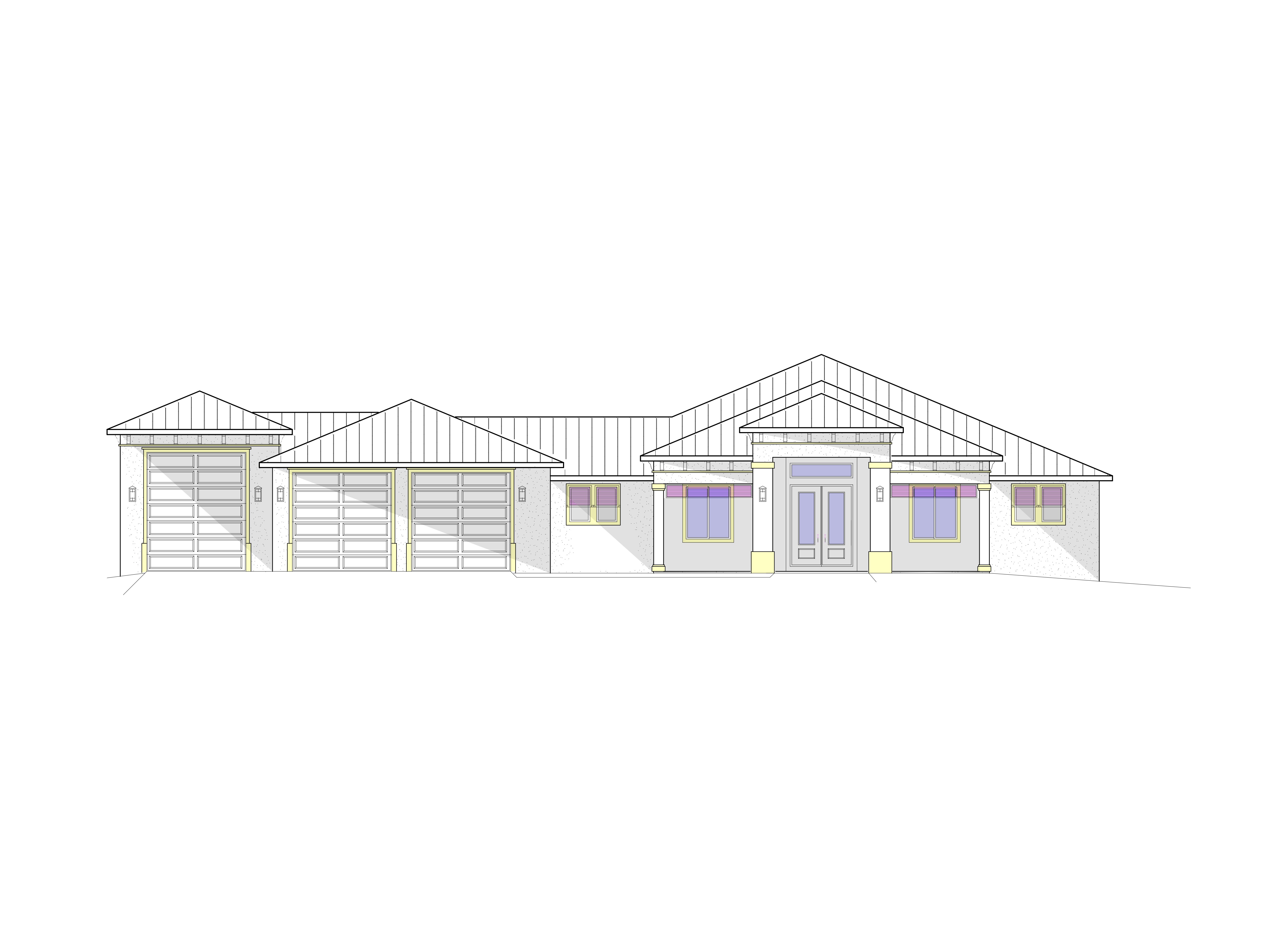 light gray standing seam metal roof light gray fascia and overhang white walls light gray banding light gray roof overhang corbles brown entry door brown garage doors white window frames white walls light blue bahama shutters white walls dappled gray circular driveway tropical landscaping entry columns 6 in front of house porches each side of entry 4 in front of house 2 garage doors 10 wide by 10 high 8 in front of house single garage door 10 wide by 12 high 7 behind garage with double doors window beside entry to have bahama shutters entry door to be single light french door