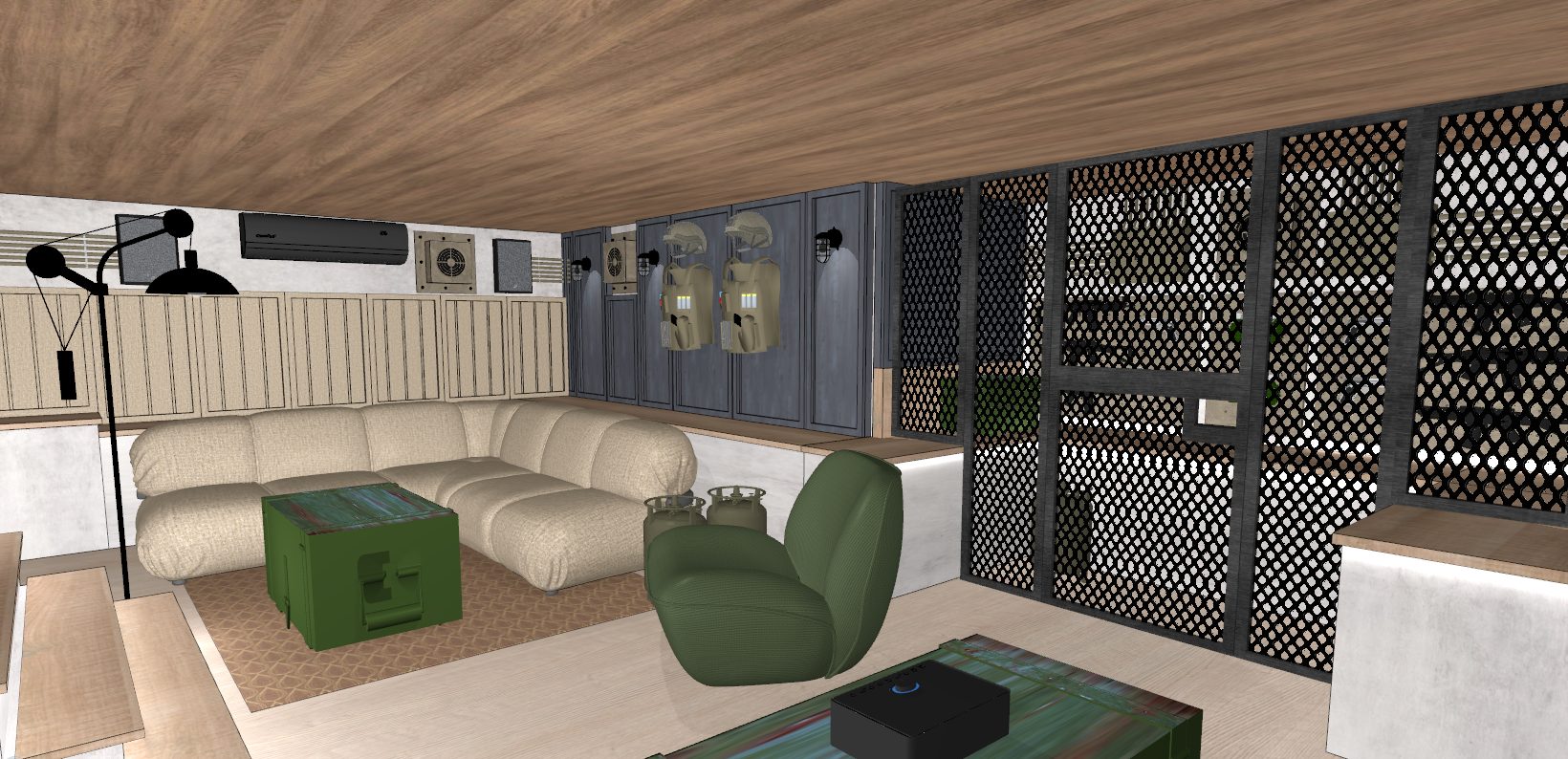 create a moody basement cinema with soft sensual lighting this has a military feeling