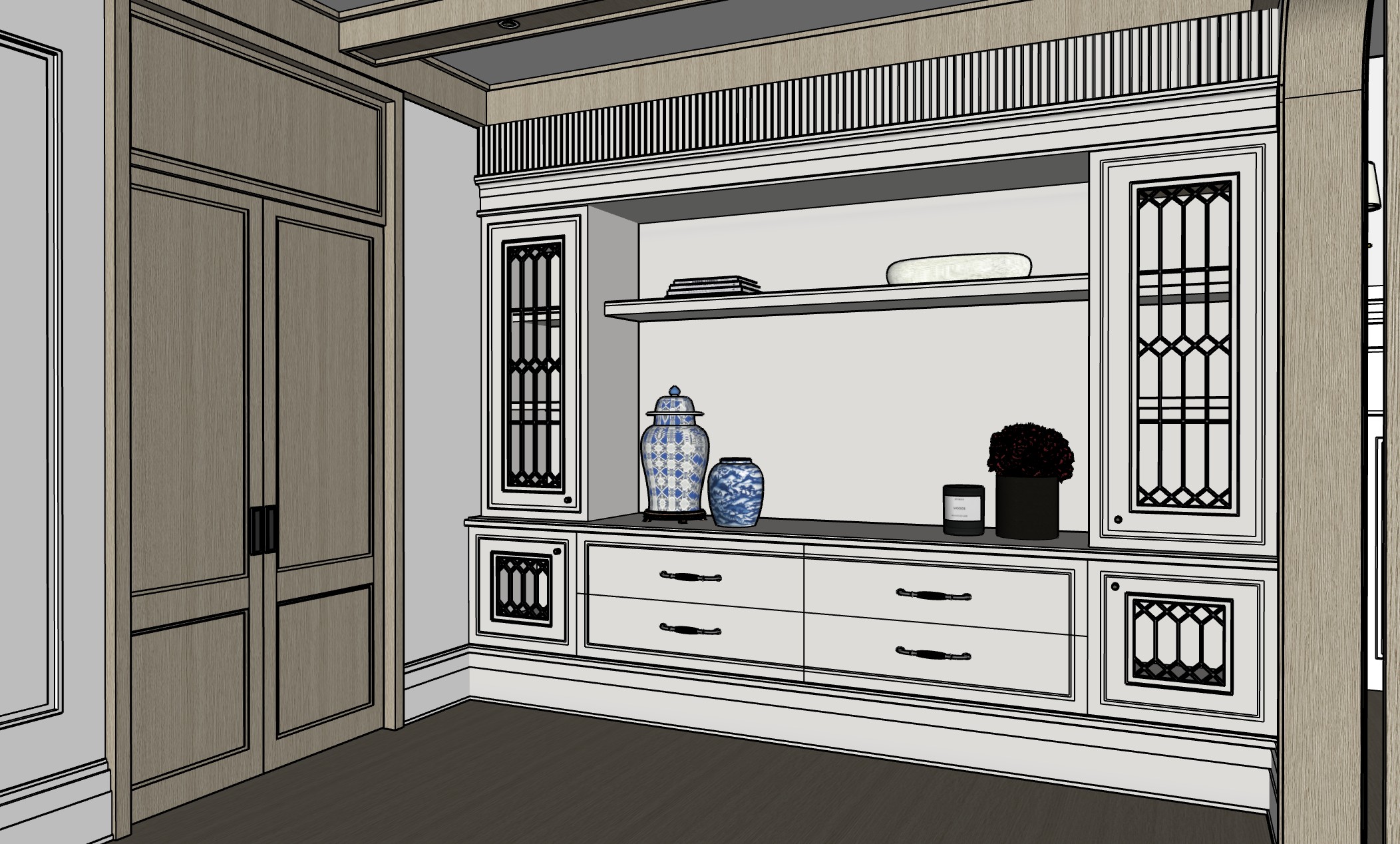 all the walls and and baseboard to be white all cabinetry to be light cream off white all wood to be white oak rigt cut finish wood floor to be light beige wood planks narrow planks make this render look chix luxurious
