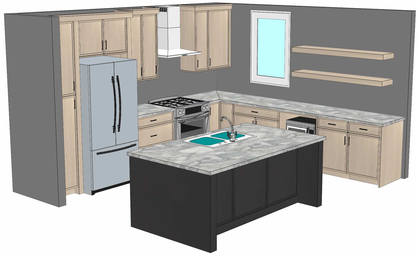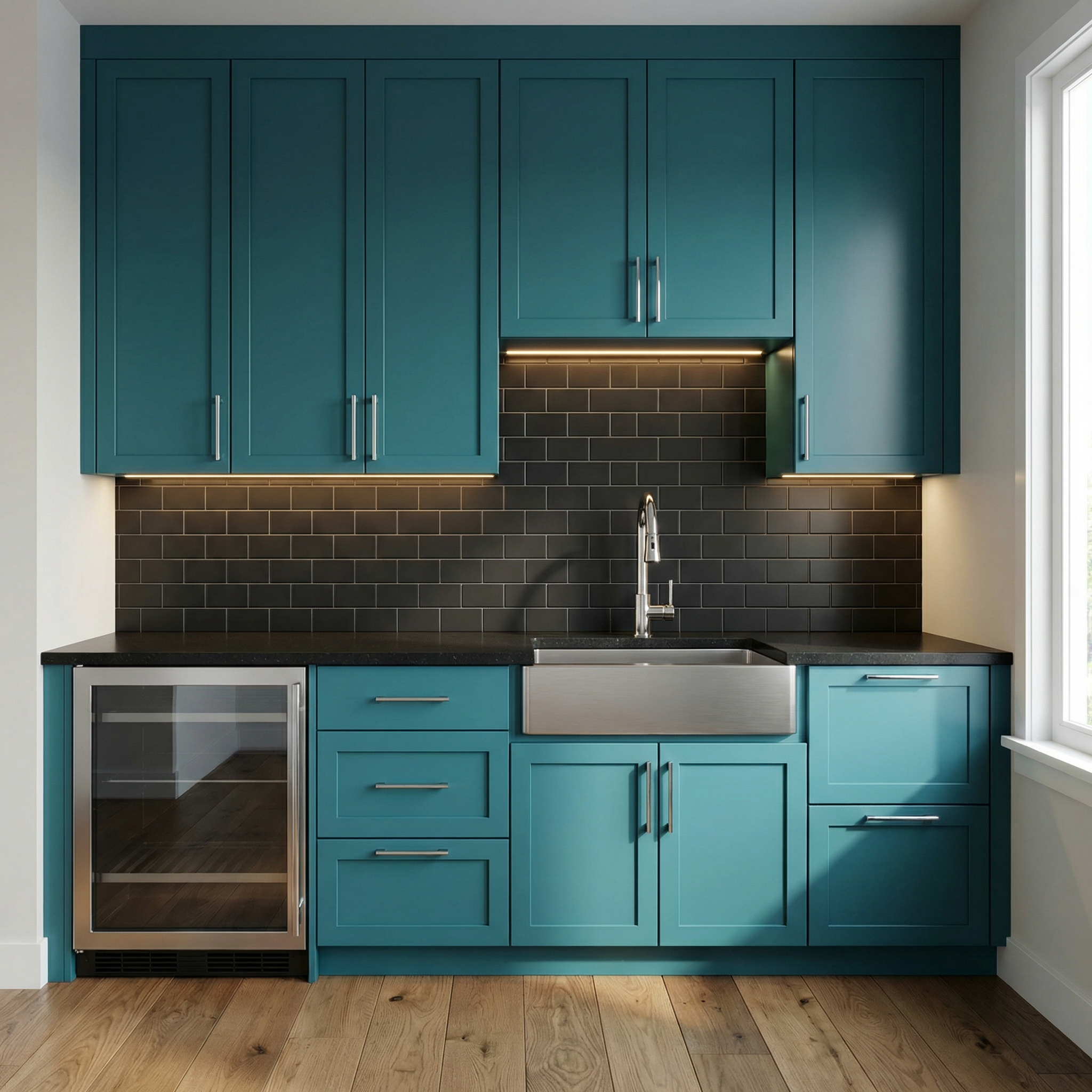 do not change the cabinets in any way preserve the exact cabinet colors materials finishes dimensions door and drawer styles hardware spacing alignment and all geometry exactly as shown do not alter the countertop shape backsplash appliances flooring lighting fixtures or wall structure only remove the construction materials clutter and mess from the scene clean the room and make it look finished and staged add a few simple tasteful home accessories appropriate for the style of the space but do not add or remove any furniture windows or architectural elements maintain the original lighting direction and realism enhance clarity and polish the photo while keeping the cabinetry and room design completely unchanged do not alter the lighting to keep the cabinet colors as they are in the image it is a window that is between the two bookshelves do not add any lighting to the cabinets