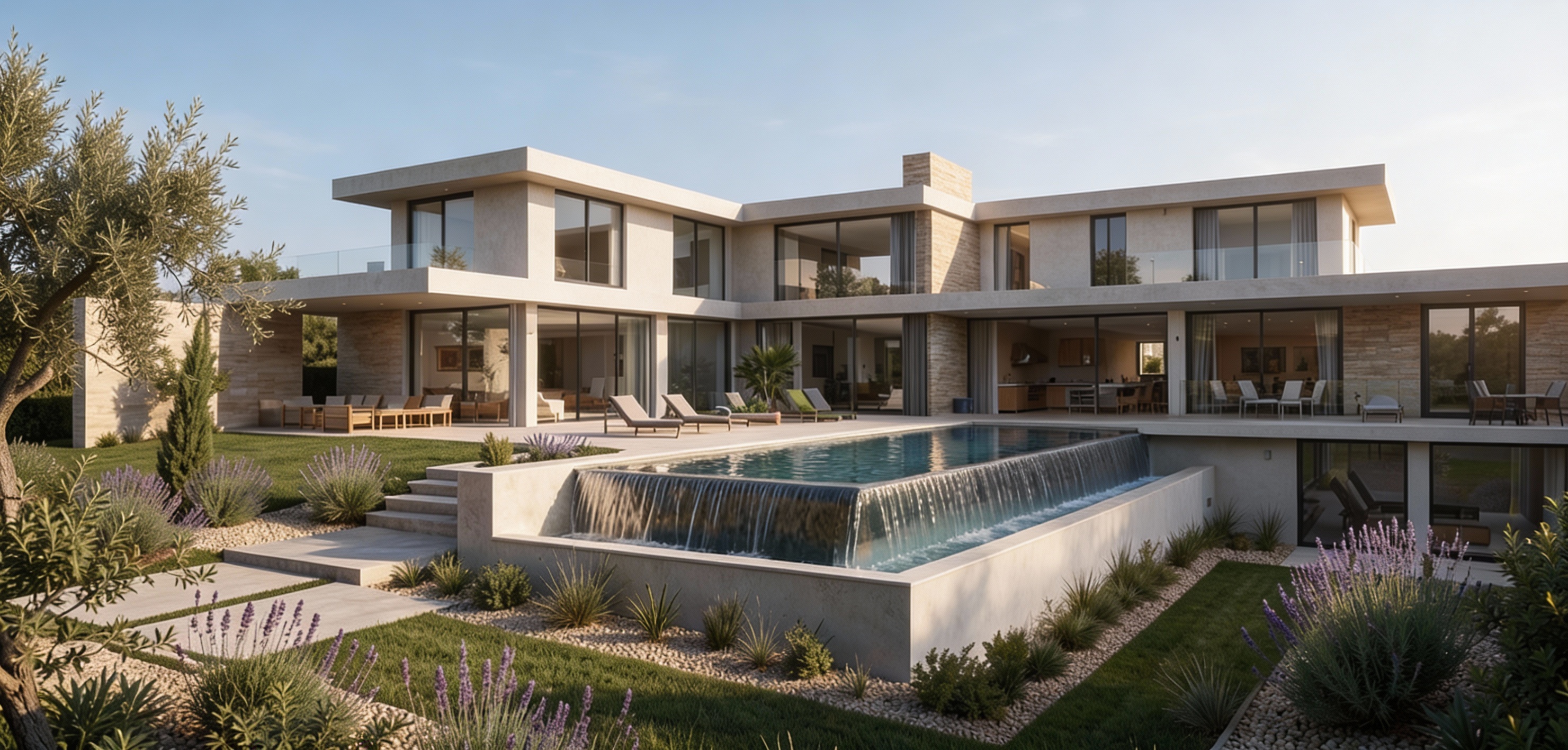 modern luxury villa with a sleek minimalist design use soft beige for the exterior walls and a light taupe for the stone accents the large glass windows should reflect the serene atmosphere the pool is a vivid cerulean blue with cascading water flowing over the edges glistening in the sunlight surround the pool with lush green grass and a variety of lavender and sage green plants olive trees add texture with their dark green leaves the atmosphere is tranquil and luxurious evoking a sense of a perfect sunny afternoon