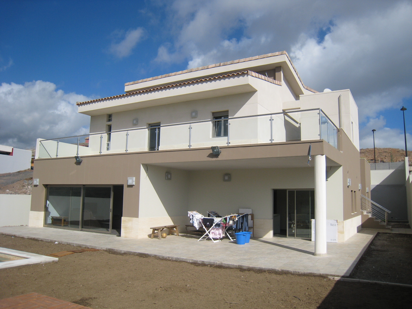 the roof will be covered with arabic tiles in a gabled style the window and door frames will be made of steel clad aluminum with a base color of gray subtropical landscaping will feature cacti succulents palm trees and plenty of lawn the glass railing on the second floor balcony will be slightly greenish and transparent people in swimsuits are by the pool with outdoor furniture it is night in summer with full moon and the sky is a bright blue the stone walls in ground floor are made of cream sandstone please respect the wall stones as they are shown in the photograph