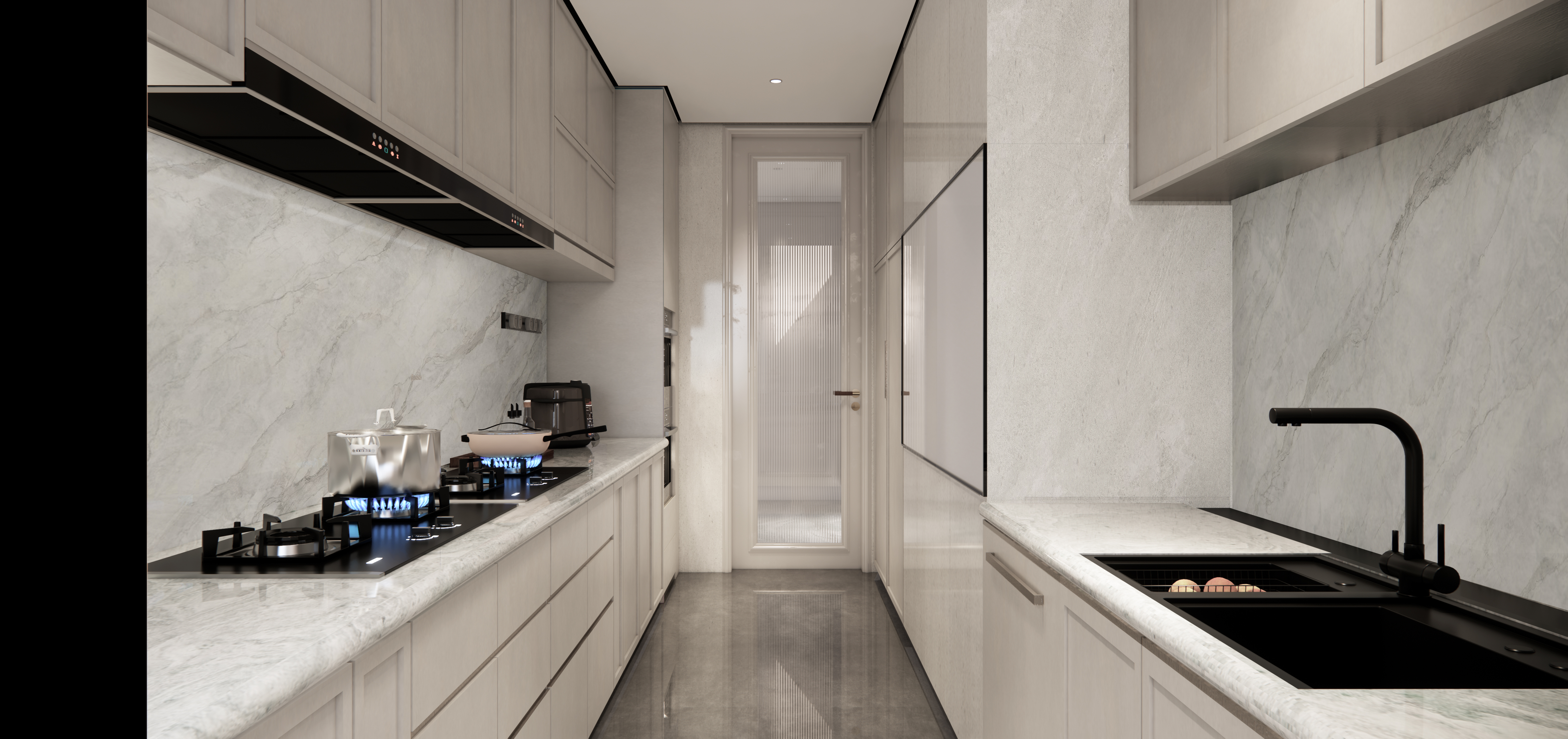 photorealistic render of a luxurious kitchen with cabinets in soft grey colour and countertop and walls in white calcutta marble the kitchen door has white door frame with inset reeded glass texture in frosted glass finish filtering in soft light the whole ambience is bright and clean and minimalistic