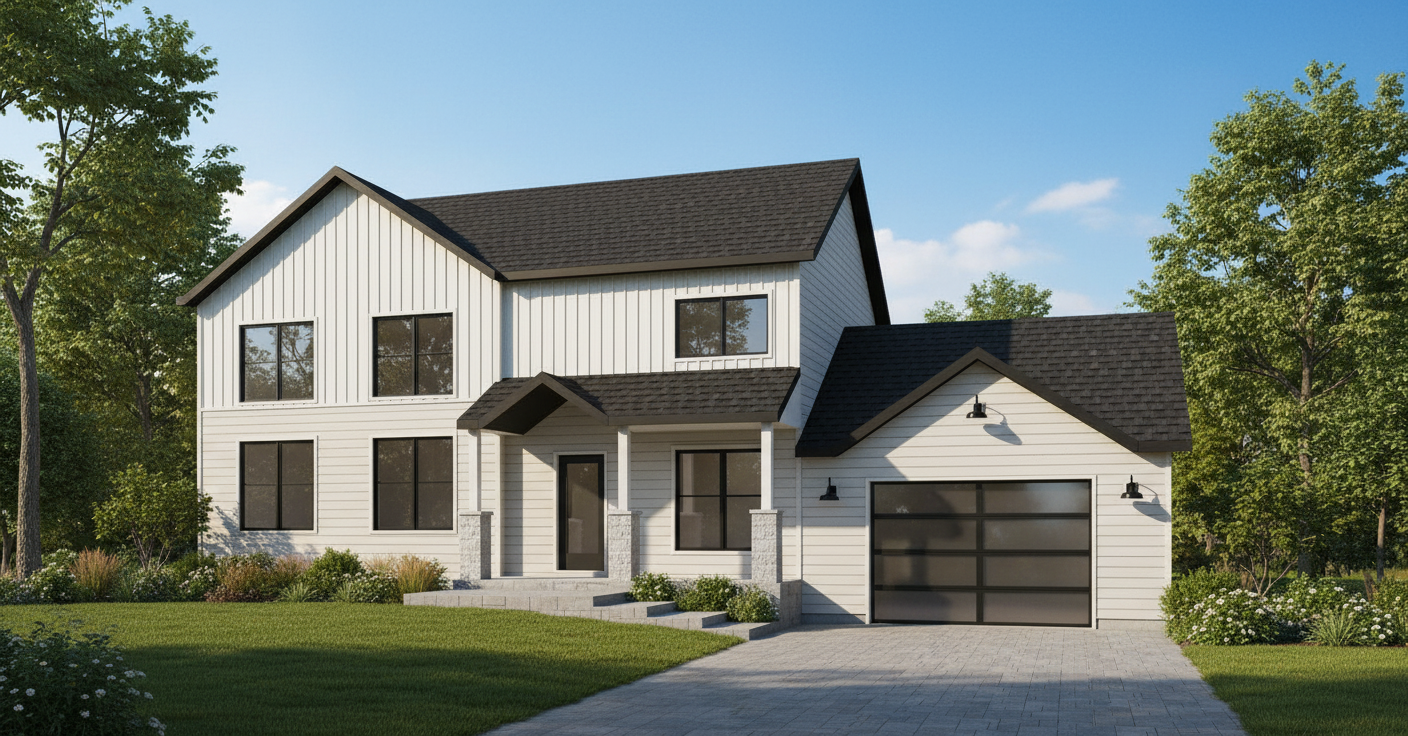 modern style house with dark roof dark cedar post red and black mix brick metal awnings dark black door and windows
