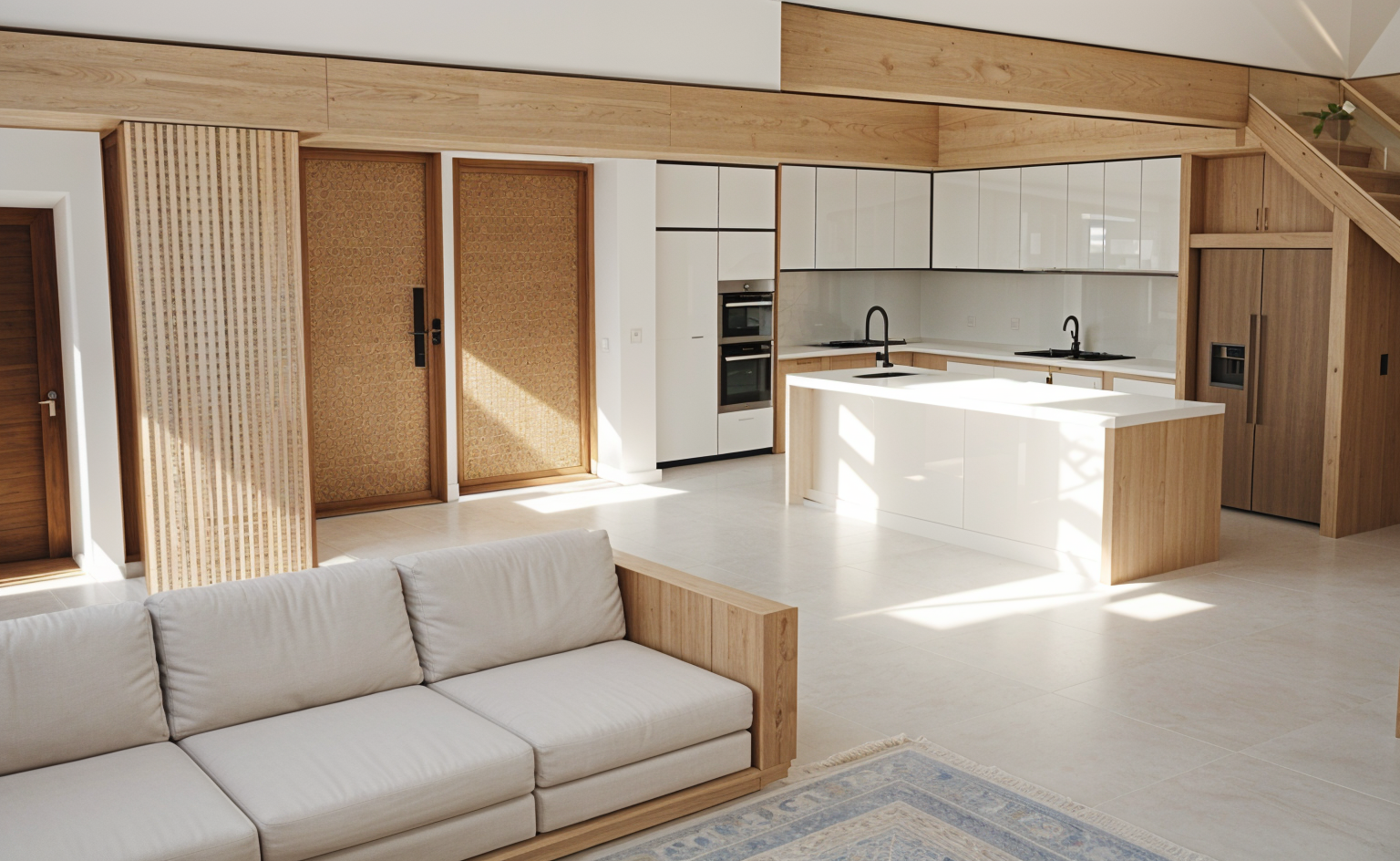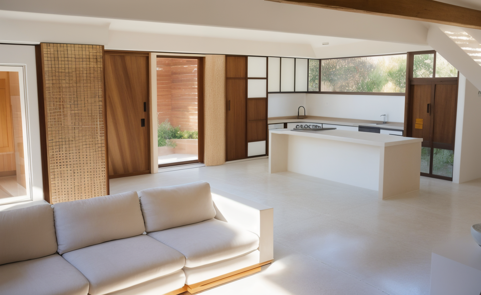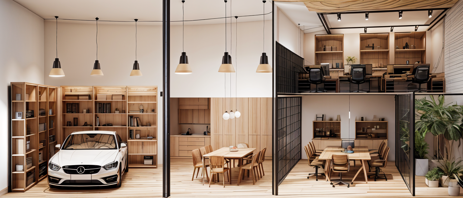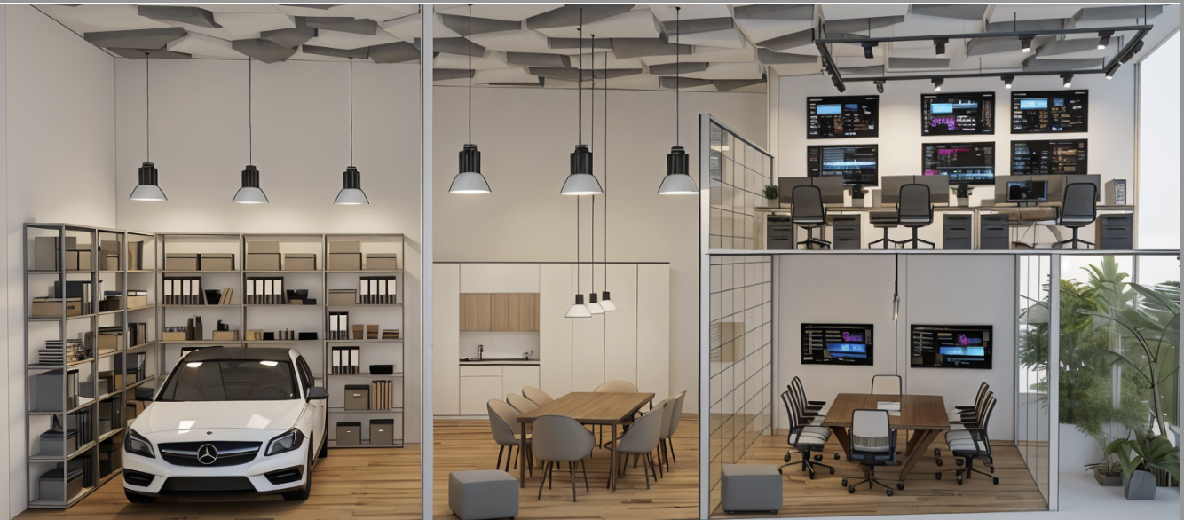 rendered concrete wall where the car is located show plaster ceiling on the garage section acoustic panelling above the centre kitchen area and bottom right conference room show a low kitchen without tall cabinetry add a tv in the conference room