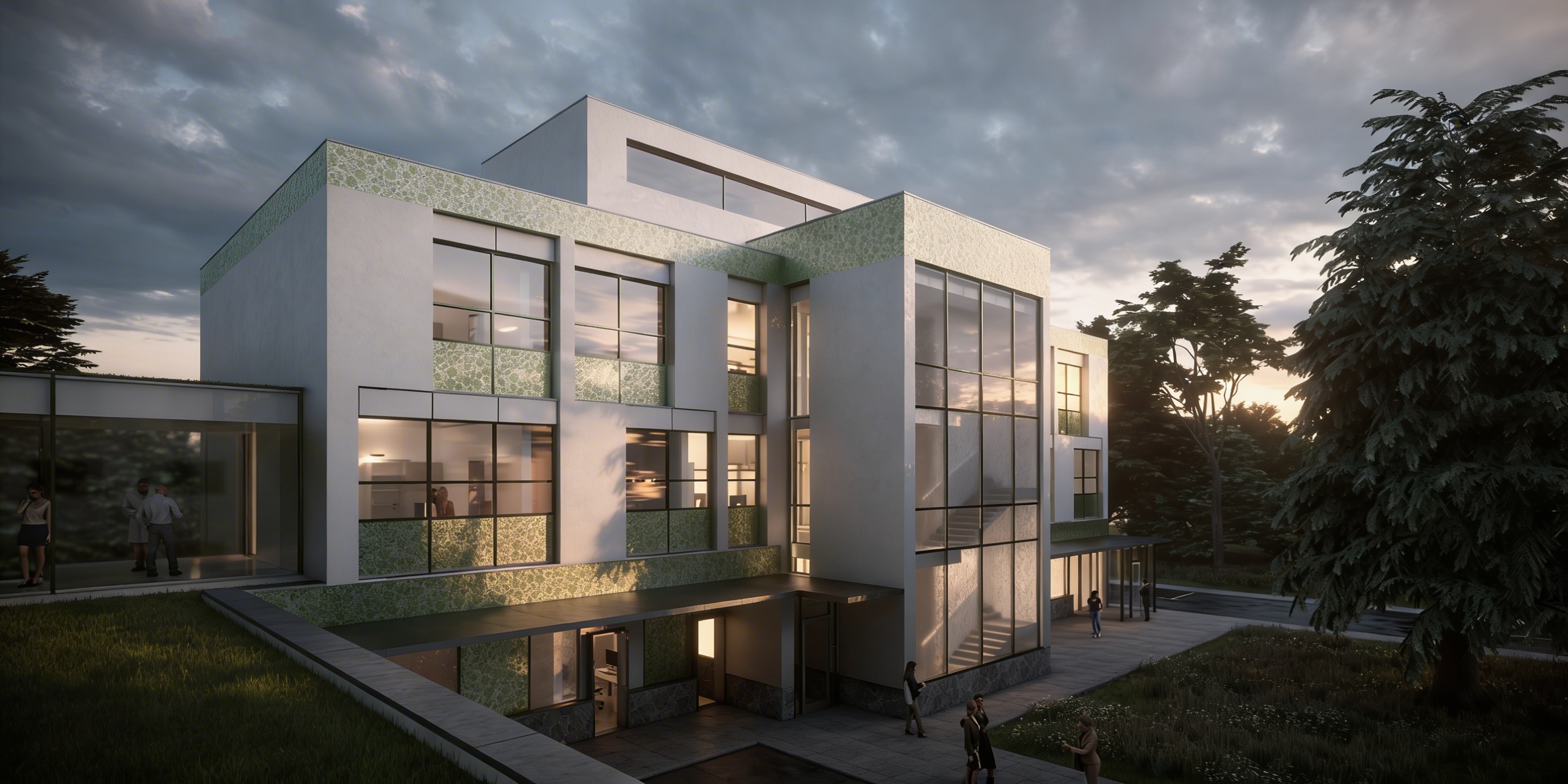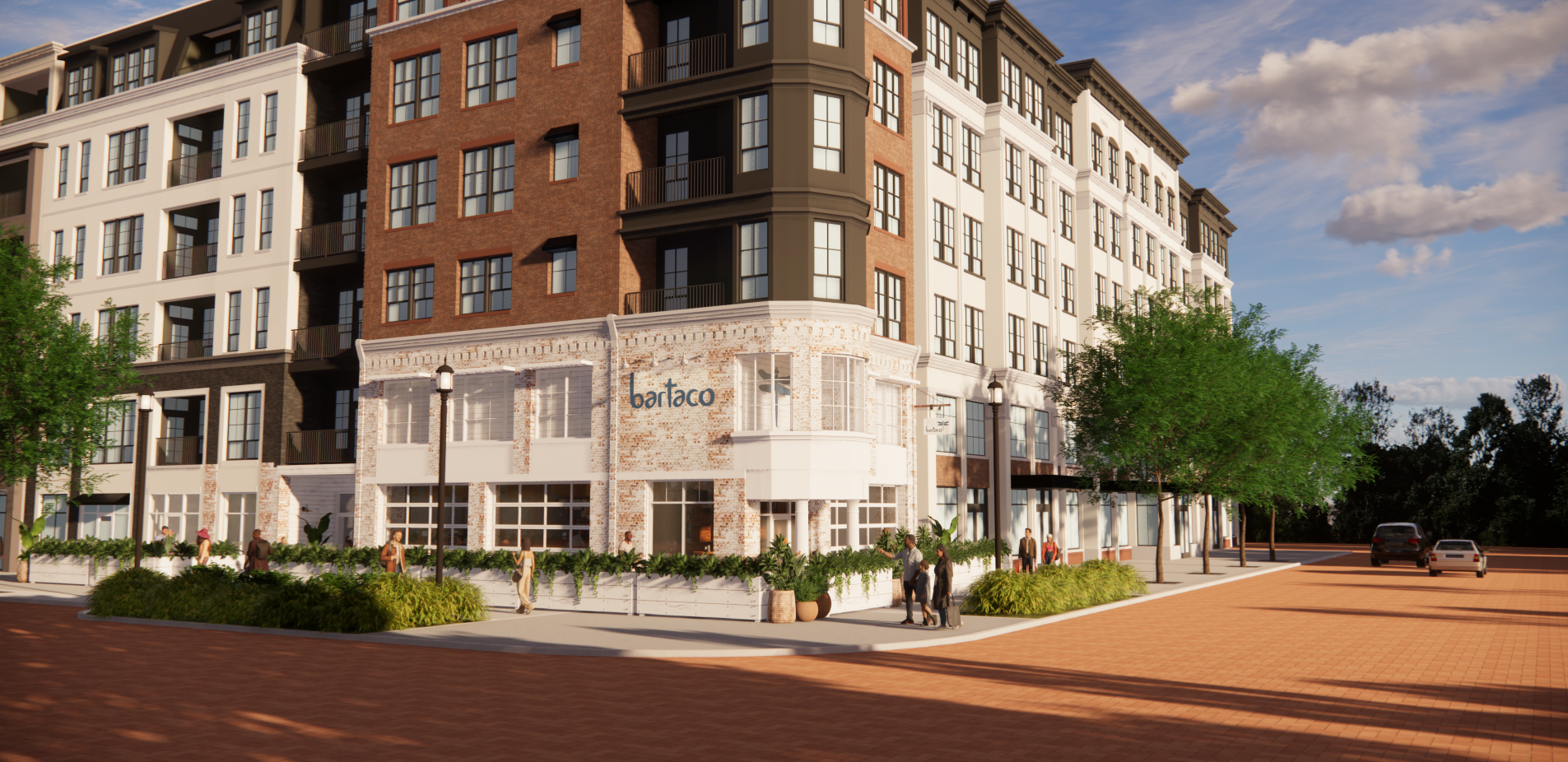 show wood timber canopy with pendant woven basket pendant lights surrounding corner of the building add taller canopy above entry on the left
