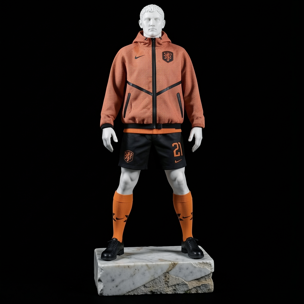 keep the jacket shorts socks and shoes as it is keep the original colors but the model is a marble statue from the ancient greece shoes have to be black keep the original colors of the clothes jacket must be same color of the original image shorts are black like original picture socks orange colors must be same hue and saturation as original picture clothes must be spotless black background