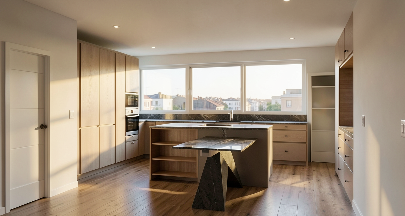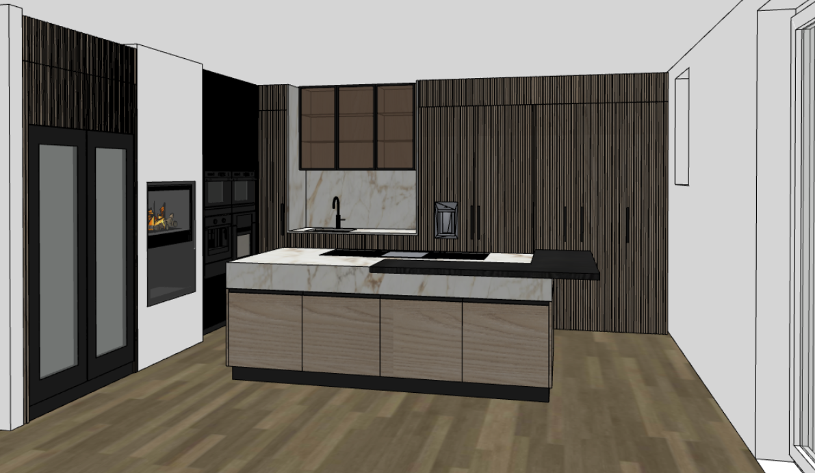 sunny weather frontpannels of the back an left side cabinets should be bright beige oak the middle part on the left side should be white painted wall please add oak floorboards