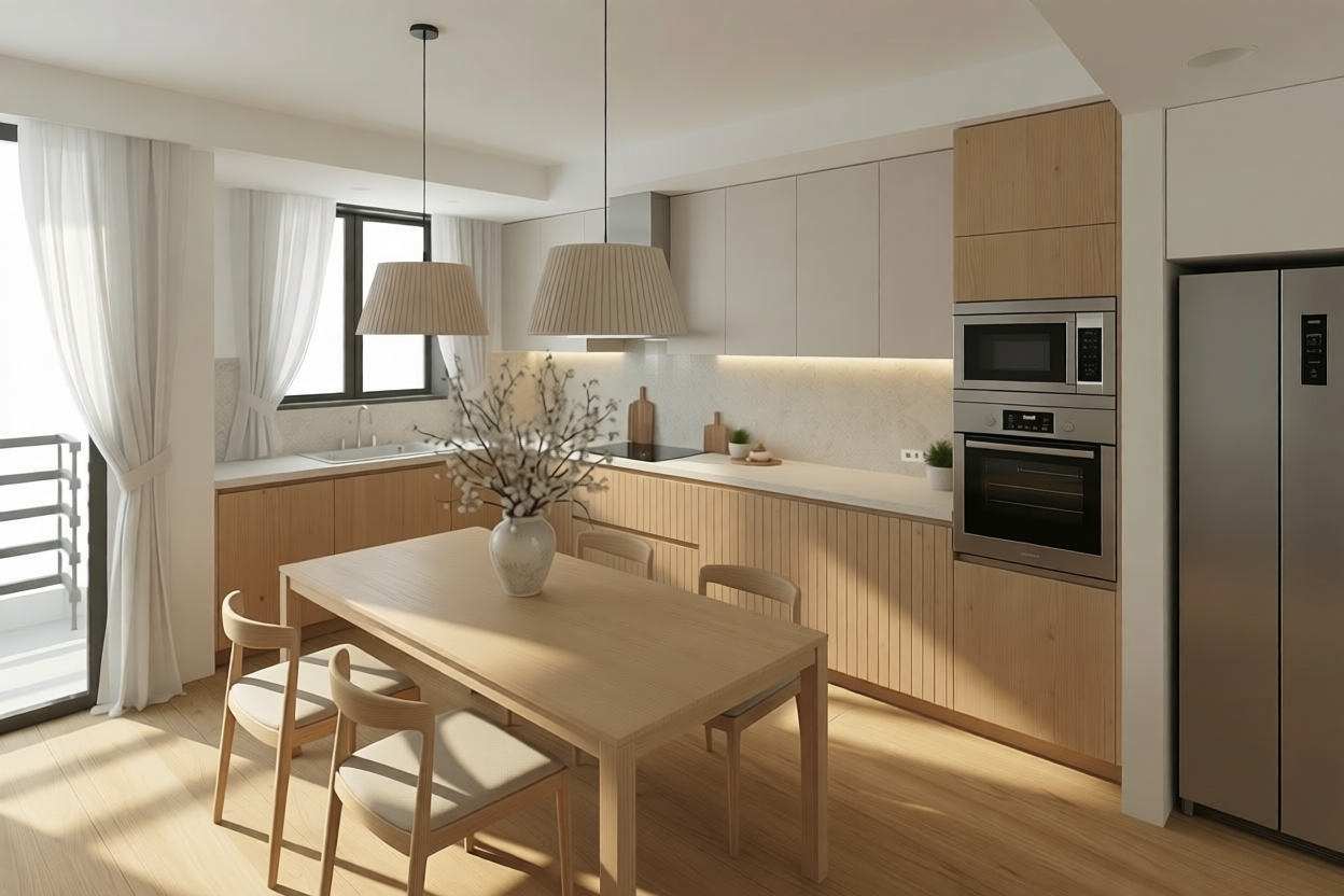 move the tower with oven and microwave to the left for 60cm and then put a narrow fridge next to it all should be placed before the partition wall