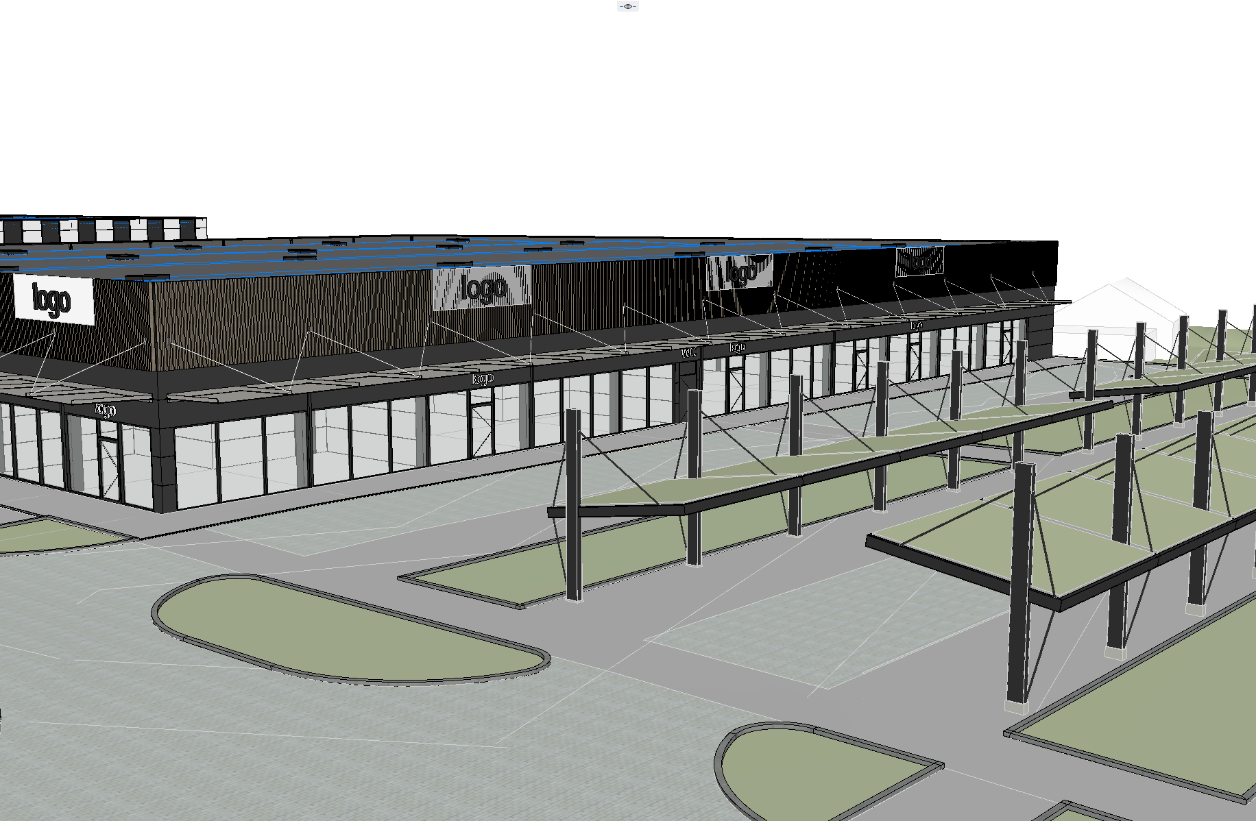 high quality photorealistic architectural visualization of a contemporary urban commercial complex focusing entirely on the foreground building preserve all architectural volumes proportions and details exactly as they are do not add remove or alter the main building forms the architecture consists of clean modern volumes with sleek reflective glass fa ades capturing natural daylight and environmental reflections primary fa ade materials are dark charcoal gray panels with refined light silver metal accents the upper part of the foreground building fa ade is wrapped with a continuous band of fine vertical wooden slats the wooden slats are narrow closely spaced and consistent in dimension forming a single uninterrupted cohesive element around the fa ade the wood has a natural warm tone with visible grain clearly contrasting with the dark panels pedestrian pathways are finished in warm gray paving complementing the architecture carport structures feature green roofs with dense integrated vegetation populate the scene with multiple cars both parked and moving to create a lively urban atmosphere vehicles should be realistic contemporary and proportionally correct without obscuring the building lush landscaping surrounds the building bright daytime lighting vivid blue sky with soft white clouds the overall atmosphere is modern premium and inviting