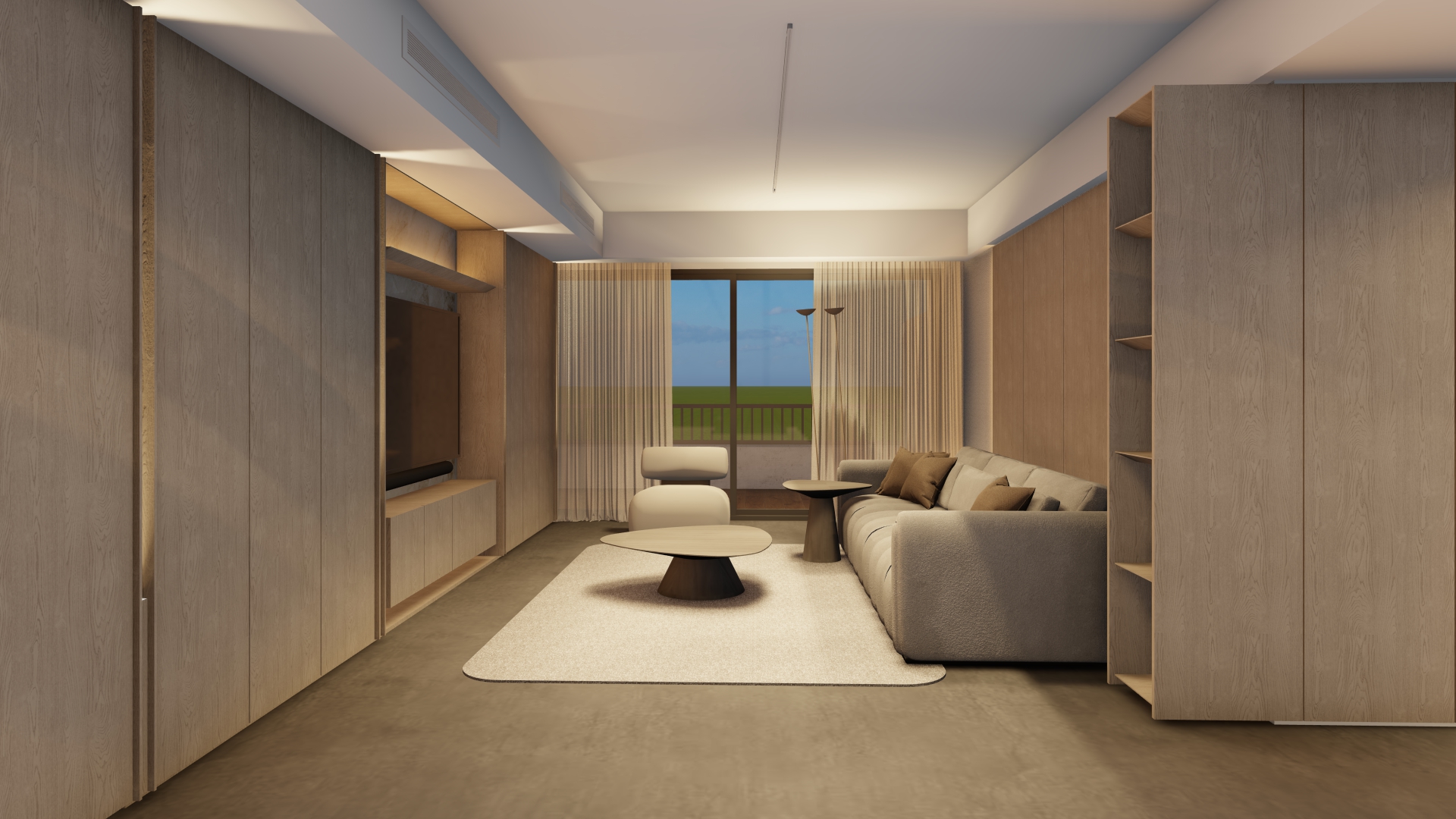render this image in a realistic style maintaining the exact same composition furnishings lightning and design without adding or removing elements the wood should be super light brown a little desaturated