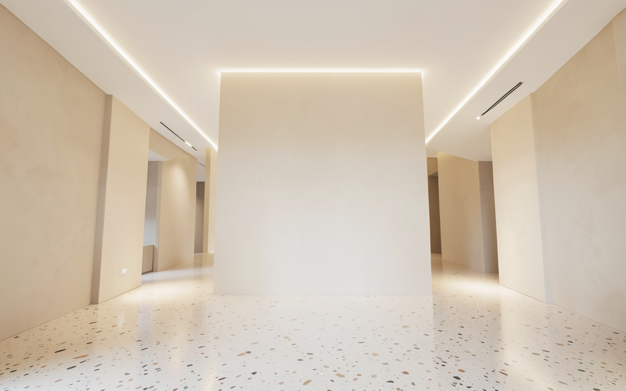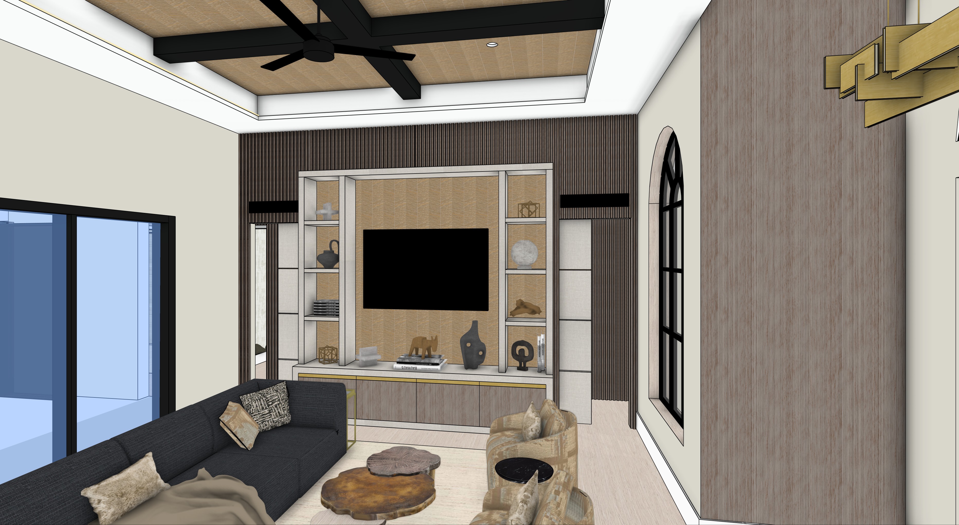 render a modern living room with a slat wall hiding two pocket doors a large built in entertainment unit with gold wallpaper at the back and off white shelving with books and accessories modern elegant neutral black beams