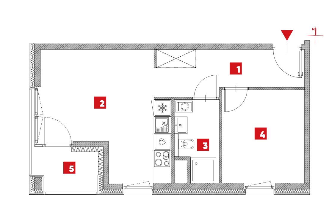 convert this floor plan into a realistic isometric 3d view of a full house show the space from an elevated angle with furniture walls and details visible create a beautifully rendered modern apartment interior from this floor plan room 1 open living area walls soft beige to create a warm and inviting atmosphere flooring light oak wood for a natural elegant feel couch l shaped upholstered in gray linen for a contemporary vibe rug large and plush in shades of blue and green to add a pop of color room 2 kitchen cabinets white with matte finish for a clean look countertop polished black granite to contrast elegantly appliances stainless steel for a modern touch room 3 bathroom tiles white with light gray veining creating a clean and airy environment fixtures chrome for a sleek modern appearance room 4 bedroom walls soft pastel blue for a calming effect bed queen size with a wooden frame and white linens for simplicity curtains light gray sheer for natural light to filter through room 5 entryway walls light gray for a neutral backdrop flooring continuation of light oak wood for cohesiveness decor minimalist with a small bench and coat hooks overall atmosphere modern and minimalistic with a cohesive color palette that offers warmth and sophistication use natural lighting to enhance the airy feel and add subtle greenery for freshness use the same furniture as shows on the plan do not change the orientation of the floorplan