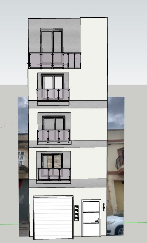 ultra realistic architectural render of the provided sketchup facade this is an image to image enhancement strictly preserve the exact front elevation view camera position proportions and composition do not change angle perspective framing or geometry in any way material distribution must follow model exactly main facade surfaces smooth painted masonry rendered plaster in a light neutral grey tone feature elements horizontal bands and balcony zones grey concrete look tile cladding main facade painted grey light warm grey not too cold slight beige undertone smooth clean matte finish very subtle fine plaster grain no stains no aging no patchiness feature bands concrete look tile medium grey tone slightly darker than facade for contrast refined architectural concrete appearance smooth or lightly textured not rough or industrial subtle tonal variation clean and modern large format panels or tiles with minimal joints important maintain clear contrast between painted facade and concrete feature zones no blending of materials no stone textures or travertine appearance balcony railings clear glass balustrades minimal framing realistic transparency and reflections apertures window and door frames in crisp white lighting natural daylight soft shadows balanced exposure context maintain surrounding buildings exactly as in the original image no redesign or reinterpretation rendering style high end photorealistic architectural visualization clean minimal contemporary urban facade strict constraints no camera movement no perspective change no material reinterpretation no additional textures beyond specified materials important treat the input image as fixed and only enhance materials and realism