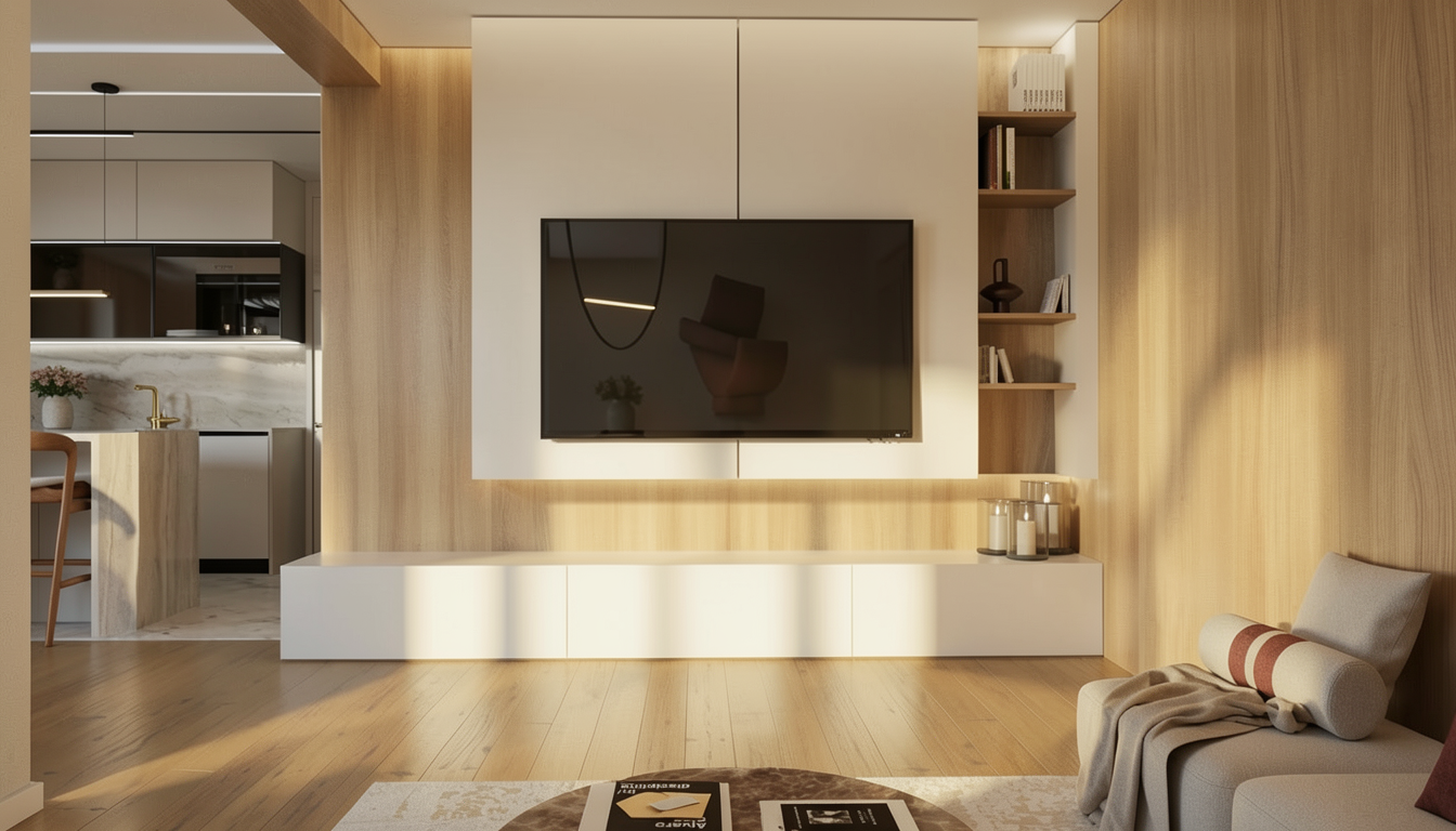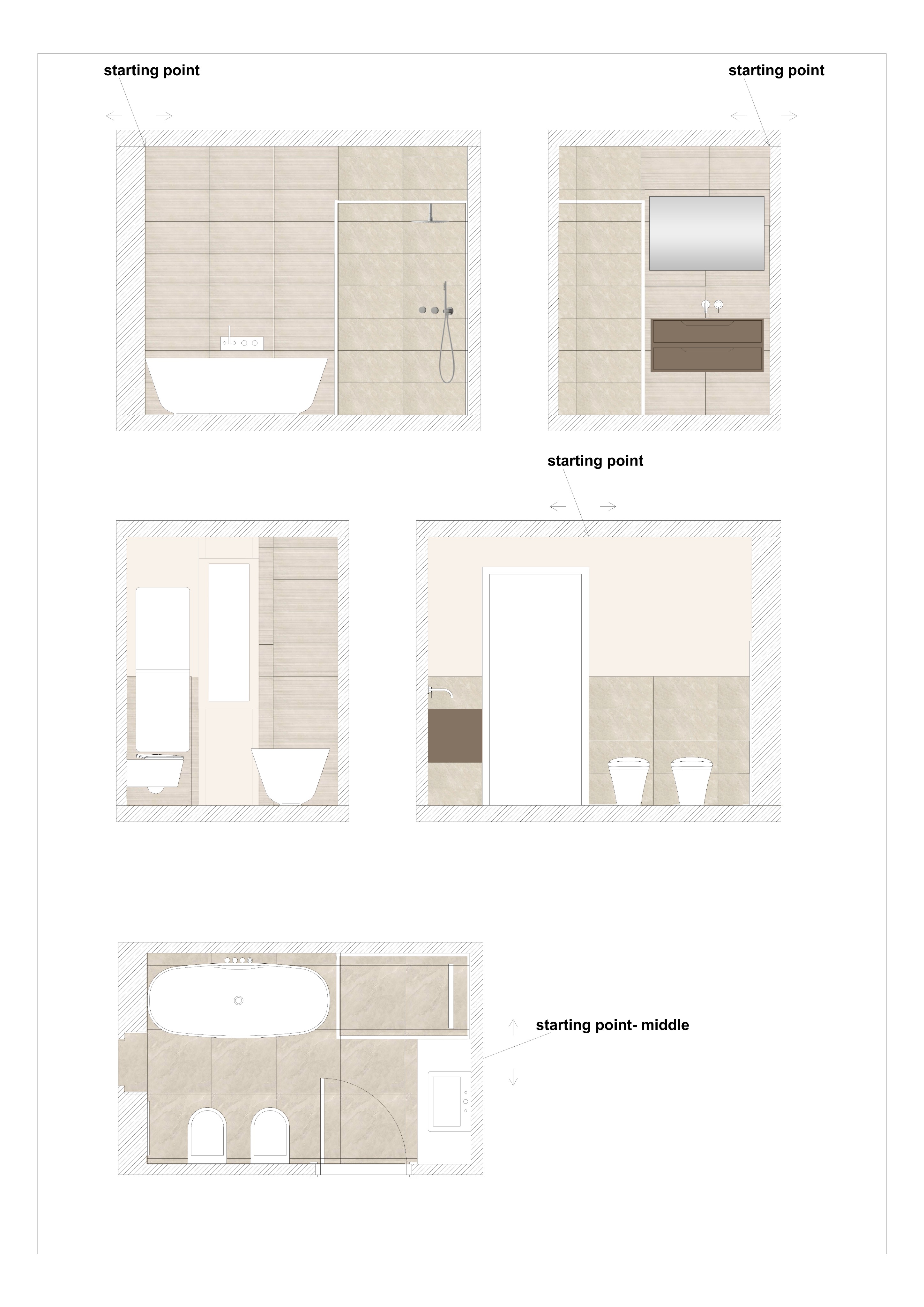 render a modern kids bathroom with a cozy atmosphere use ivory avorio 60x60 tiles for the floor creating a soft warm base inside the shower use white bianco 30x60 tiles up to a height of 2 40 meters for a clean fresh look behind the vanity mix textures with bianco mini in regolo 120x60 tiles up to 1 20 meters for a striking accent wall keep the remaining walls in a smooth neutral resin to maintain warmth incorporate a sleek vanity with a modern oval mirror above accented by gentle ambient lighting at height 2 10 meters opt for soft beige and grey tones to complement the ivory and bianco creating a serene and inviting space