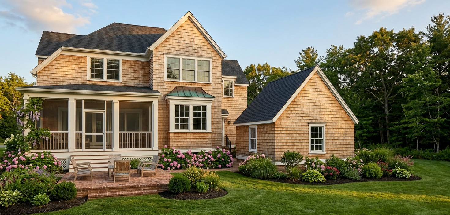 render a modern two story house with a sleek design featuring a combination of charcoal gray and natural wood exterior the charcoal gray siding should be smooth with a matte finish complementing the warm rich tone of the vertical wooden accents large windows with black frames are prominent on both levels reflecting a clear blue sky the atmosphere is serene and contemporary with soft natural lighting enhancing the textures and colors include a minimalist light gray driveway leading to the double garage highlighting the modern aesthetic the home is on a corner lot in a new subdivision