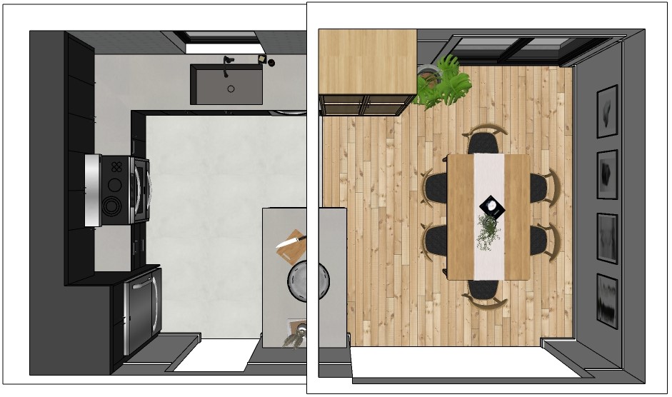 modern kitchen with a clean minimalist design white shaker cabinets and tiled backsplash stainless steel appliances light wood flooring for warmth neutral toned barstools with soft gray upholstery subtle stone texture on the partition wall soft natural lighting creates a cozy inviting atmosphere