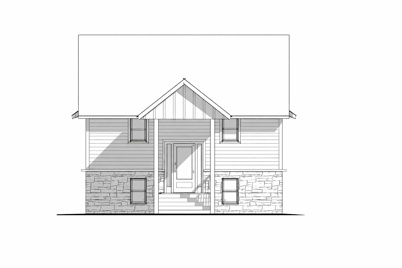 turn this line drawing into a realistic photo of a house change no architectural details add some landscaping and have a lake behind it
