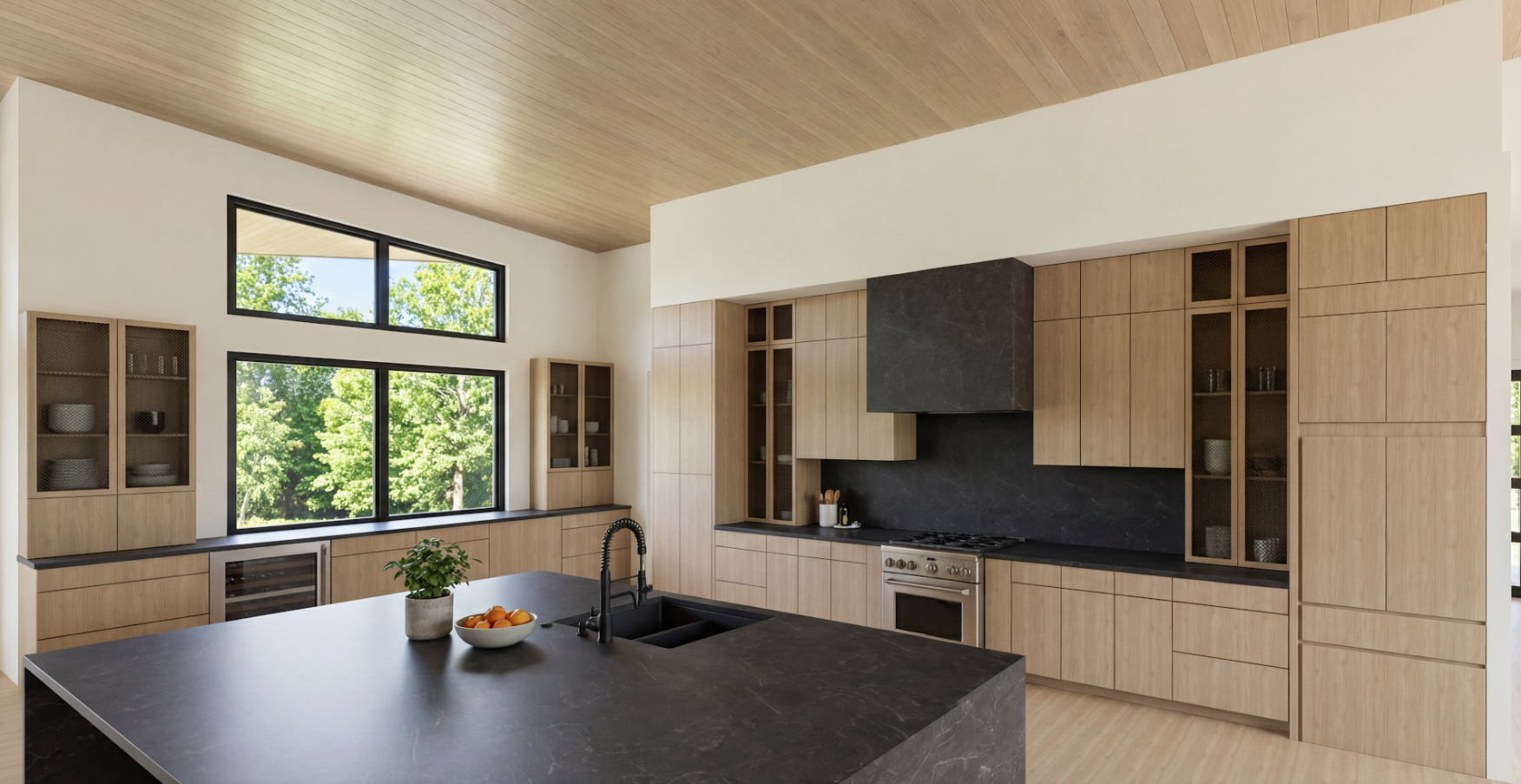 use this exact rendered image as the base every single element is preserved exactly as shown oak cabinetry dark honed stone countertops backsplash hood range wine fridge sink black faucet ceiling planks flooring island fruit bowl plant natural daylight trees blue sky all completely unchanged the only change is the one listed below one change only replace all mesh wire cabinet inserts with fluted glass every cabinet door currently showing a mesh or wire insert the tall cabinet on the far left wall the smaller cabinet to its right by the window and all glass front cabinets flanking the hood on the right wall must have their door inserts replaced with vertical reeded fluted glass the fluted glass has tight evenly spaced narrow cylindrical vertical ribs running the full height of each door panel from top to bottom the ribs are densely packed at least 15 to 20 individual ribs visible across each door width each rib no wider than 10 to 12mm the glass is semi transparent interior contents plates cups ceramic objects wine glasses remain softly and elegantly visible but naturally diffused through the ribbing the way real reeded glass behaves in daylight each rib catches natural light along its curved surface creating a subtle linear glare and real dimensional depth this is not frosted glass not flat glass not printed texture it is three dimensional vertically ribbed reeded glass with physical depth all cabinet frames oak bodies proportions and surrounding cabinetry remain exactly as shown the fluted glass is consistent in rib scale density and translucency across every cabinet in the image left wall and right wall match perfectly as one unified material no knobs no pulls no hardware of any kind on any cabinet anywhere in the image all doors push to open completely clean flat faces do not add any furniture fixtures lighting decor or architectural elements beyond what is already shown
