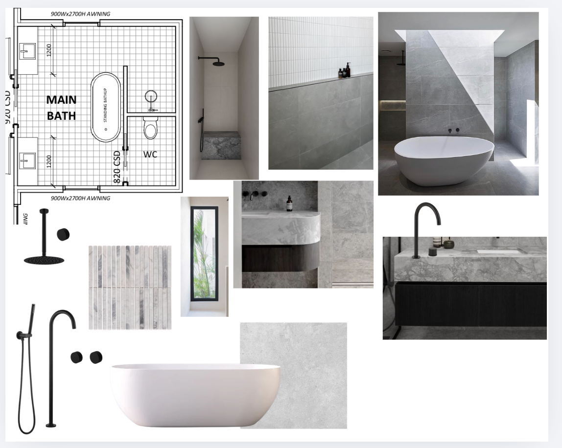create architectural elevations and a photorealistic render based strictly on the attached floorplan and mood board style modern zen masculine bathroom minimalist soft luxury warm neutral palette layout must follow the floorplan exactly do not change structural walls window positions door openings bath location or wc placement materials finishes main floor and walls large format light grey stone tiles approx 600x600 or 12x24 laid in straight stack pattern feature wall vertical fluted light stone tiles as per mood board bath freestanding matte white oval bath centred as per plan vanity floating black vanity with curved or soft edge stone top light marble quartz with subtle veining basin integrated or stone top basin all tapware and fixtures matte black as per image windows tall narrow window as shown soft daylight entering lighting concealed led strip lighting in niches and under vanity soft natural daylight with shadow play overall feel calm moody architectural spa like masculine but warm render style high end architectural visualization realistic textures soft shadows natural light no staging clutter clean minimal styling