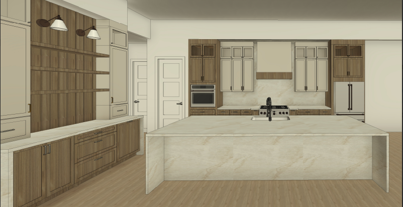 realistic photographic interior rendering in natural daylight use the provided sketchup base image as the structural reference preserve every single architectural element exactly as positioned all cabinetry layout open shelving island proportions wall oven gas range refrigerator sink faucet interior doors ceiling flooring and all structural walls remain completely unchanged do not add remove or reposition anything except what is explicitly stated below atmosphere light warm natural daylight filling the space softly gentle ambient shadows the existing wall sconce fixtures remain exactly as positioned champagne brushed bronze finish warm and aged not shiny brass not chrome no pendant lighting added anywhere cabinetry painted cabinets every painted cabinet the tall cabinet tower on the left wall the upper cabinets flanking the hood and any other painted section shown renders in a warm taupe cream that reads almost white but not quite the tone is a soft creamy off white with a whisper of warm beige taupe undertone sitting just beneath the surface refined quiet barely there warmth it should read as an elevated warm off white from across the room but reveal its soft taupe cream depth on closer look not stark white not bright white not grey not yellow shaker style door and drawer profiles exactly as shown on every painted cabinet cabinetry wood cabinets every wood cabinet renders as a warm neutral smoked oak with a taupe undertone a medium depth oak that reads balanced neither too cool nor too warm the base tone is a refined taupe brown with visible straight grain running vertically the grain is pronounced and visible but the overall color stays calm and neutral aged european smoked oak at a perfect middle tone not golden not blonde not grey not dark walnut matte to satin finish no gloss this tone applies to every wood cabinet every wood drawer front and every open wood shelf in the image hood the hood body renders in the same warm taupe cream painted finish as the painted cabinets the hood s trim detailing and any framing accents render in the same warm neutral smoked taupe oak as the wood cabinets creating a two tone architectural moment that ties the palette together critical glass placement locked glass inserts appear only on the upper cabinets that already show glass in the base rendering the small upper cabinets flanking the hood area every other cabinet every painted taupe cream cabinet every lower wood cabinet every drawer front every pantry tower has solid opaque shaker doors or drawer fronts with absolutely no glass do not add glass to any cabinet that does not already show glass in the base image do not make anything transparent that is not already transparent hardware every single pull and knob throughout the entire kitchen is champagne brushed bronze warm aged slightly darkened gold bronze tone not yellow brass not polished gold not chrome not black present on every cabinet door and every drawer front throughout the entire kitchen countertops island backsplash all these surfaces are the same continuous stone a warm creamy beige quartzite in the spirit of taj mahal quartzite base color is a warm sand cream with a soft blush ivory undertone not white not grey veining is soft flowing cloudlike diffused taupe and warm golden grey movement blending into the background rather than sitting boldly on top subtle organic and luminous wraps the full perimeter countertop the island top and waterfall edge and the full height backsplash behind the range polished finish with a quiet warm sheen new coffee nook in the small recessed bay on the left in the small recessed bay alcove on the left wall the narrow inset area between cabinet runs style a minimal integrated coffee nook the countertop in this nook matches the same warm beige quartzite continuously on the counter surface one modern matte black or brushed stainless espresso machine compact minimal not bulky a small matte ceramic canister set of two cream or soft taupe a small stack of two ceramic espresso cups with saucers and one small trailing plant in a minimal ceramic pot the wall behind the nook in this recessed area is finished in the same warm beige quartzite backsplash continuing up the wall tying it into the main kitchen material palette clean intentional and editorial not cluttered the coffee nook is styled within the existing recessed architectural space only do not add new walls cabinets or structural changes sink stays exactly as shown same material same color same finish appliances wall oven exactly as shown gas range exactly as shown refrigerator panel ready or stainless exactly as shown no changes open shelving left wall renders in the same warm neutral smoked taupe oak as the wood cabinets styled with one small trailing green plant in a simple matte ceramic pot a tight stack of two linen covered hardcover cookbooks lying flat and one minimal matte ceramic vessel clean and intentional glass cabinet interiors only where already shown in base neatly stacked white ceramic plates simple glassware and one small minimal ceramic object visible through the glass island styling one medium leafy green plant in a minimal stone or ceramic pot one ceramic fruit bowl with mixed seasonal fruit two hardcover books stacked flat with a small object resting on top nothing else on the island surface flooring light natural wood plank flooring exactly as shown warm pale tone straight planks unchanged do not add glass to any cabinet not already shown with glass do not add pendant lighting do not add rugs furniture or any architectural elements beyond what is take away the glass cabinets that are long by the hood theyshould be like the image i posted