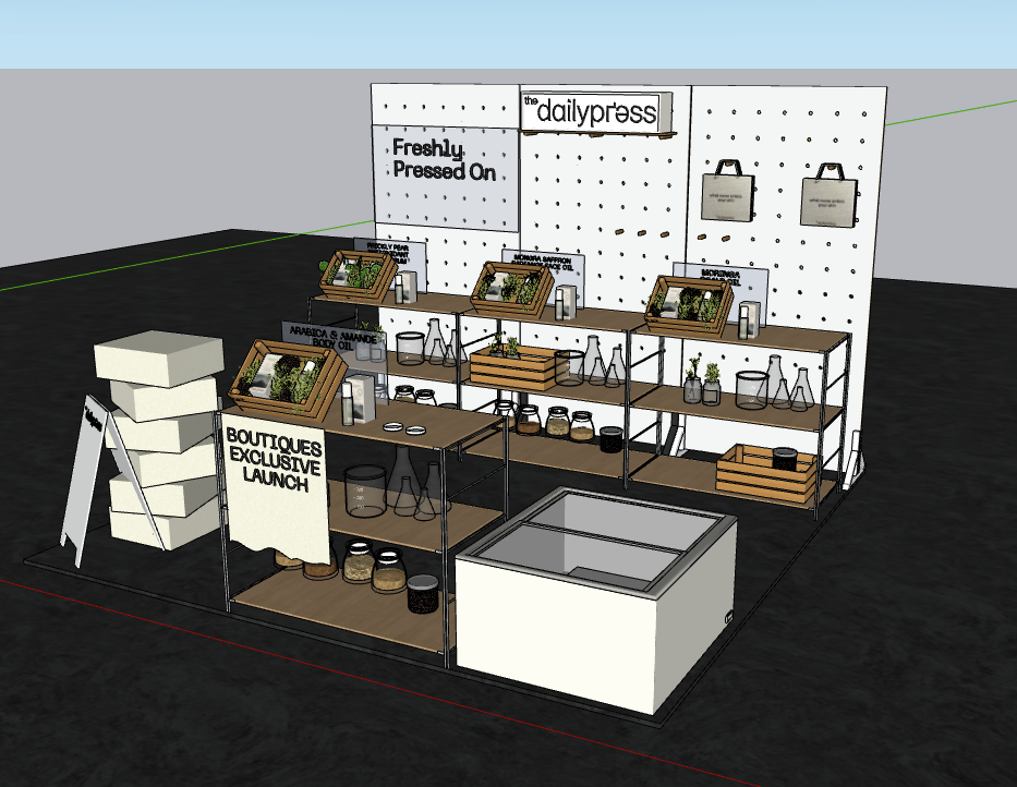 indoor realistic ligthing of a popup booth display the logo light box in the middle at the top