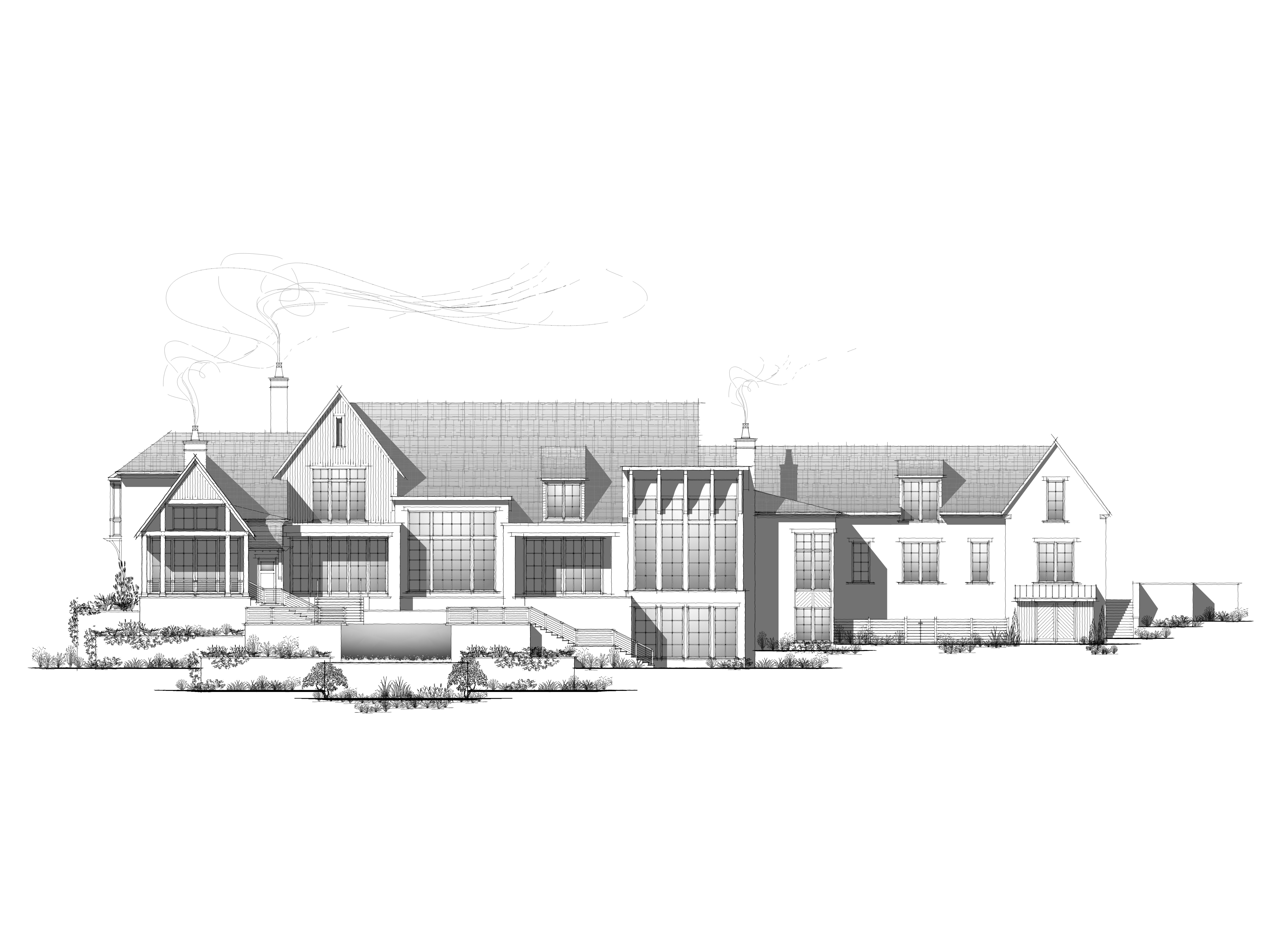 exterior shot architectural elevation converted to a refined black and white graphite pencil drawing preserve the original linework exactly no changes to architecture proportions windows rooflines or details maintain crisp technical elevation lines add subtle graphite shading to roof planes under eaves recessed glazing and wall offsets for depth introduce soft ground shadows to anchor the building add light loose deciduous tree masses in the background behind and at the sides of the house drawn with soft atmospheric pencil texture include a very light graphite sky wash with gentle horizontal blending and faint cloud texture minimal foreground planting with loose shrub masses high key presentation style clean architectural rendering professional hand drawn elevation no design alterations no perspective distortion no added architectural elements