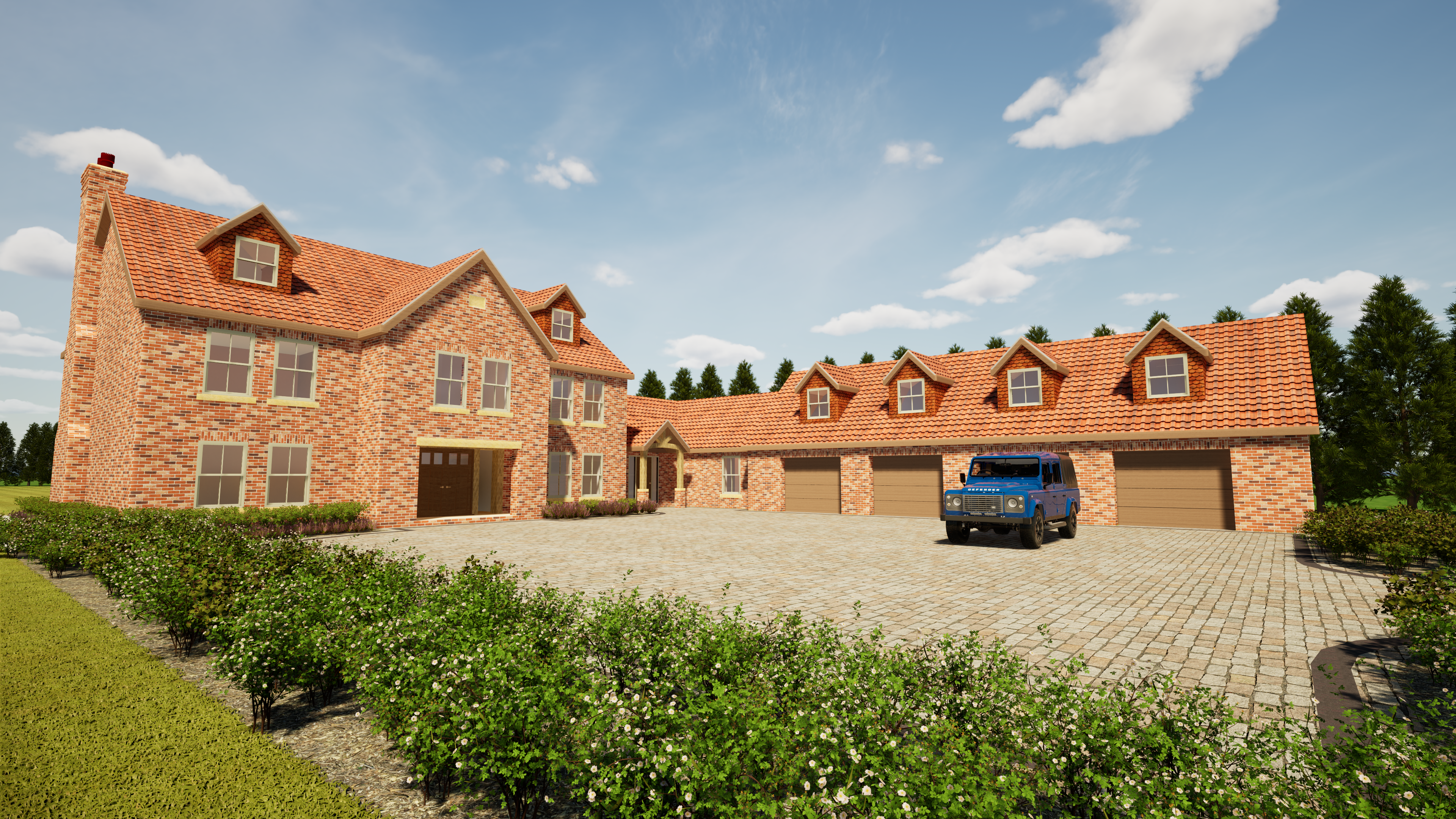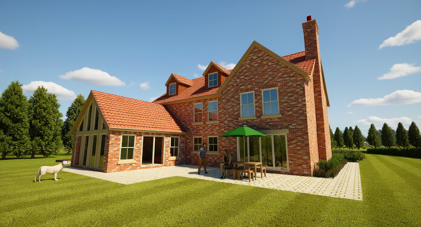 summer lighting with and realstic shadows light clouds maintain colours shape and design of image red pan tile roofing